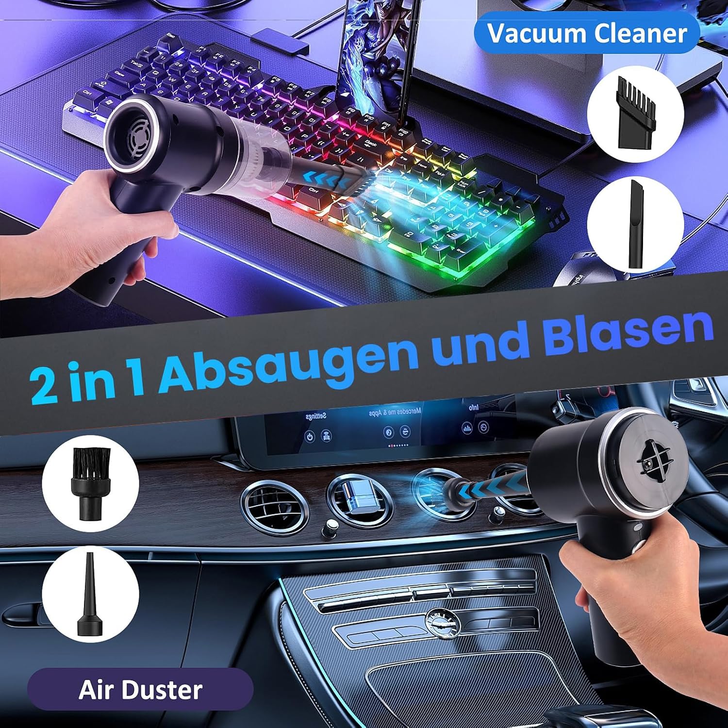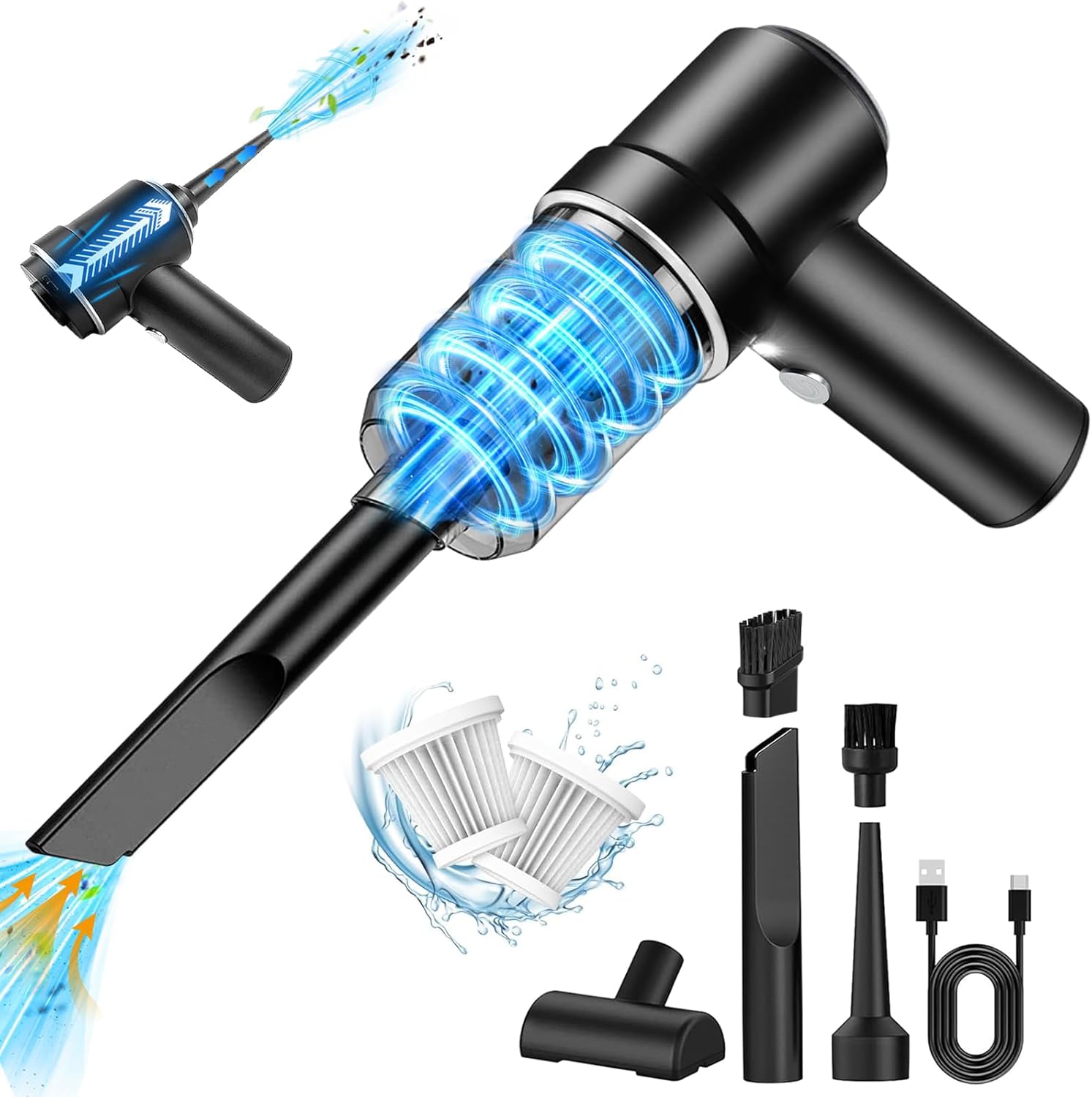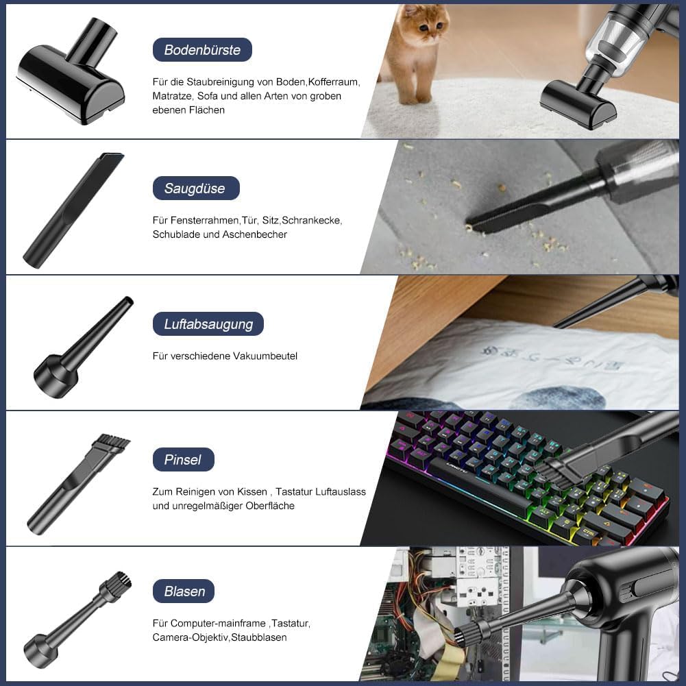 5 accessories and multipurpose: the hand vacuum cleaner comes with many different removable brush head nozzle accessories for cleaning different scenes according to your needs, which makes cleaning easier. For example, the extended nozzle is suitable for you to get into all hard-to-reach corners and cracks. A brush with double suction and wiping function is suitable for cleaning dust on the surface of carpets, keyboards and air conditioning outlets.