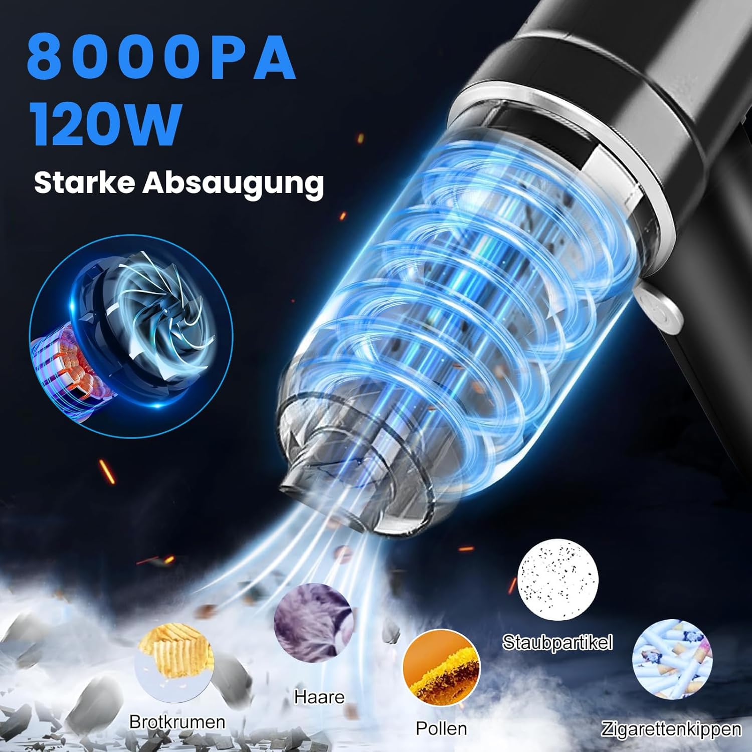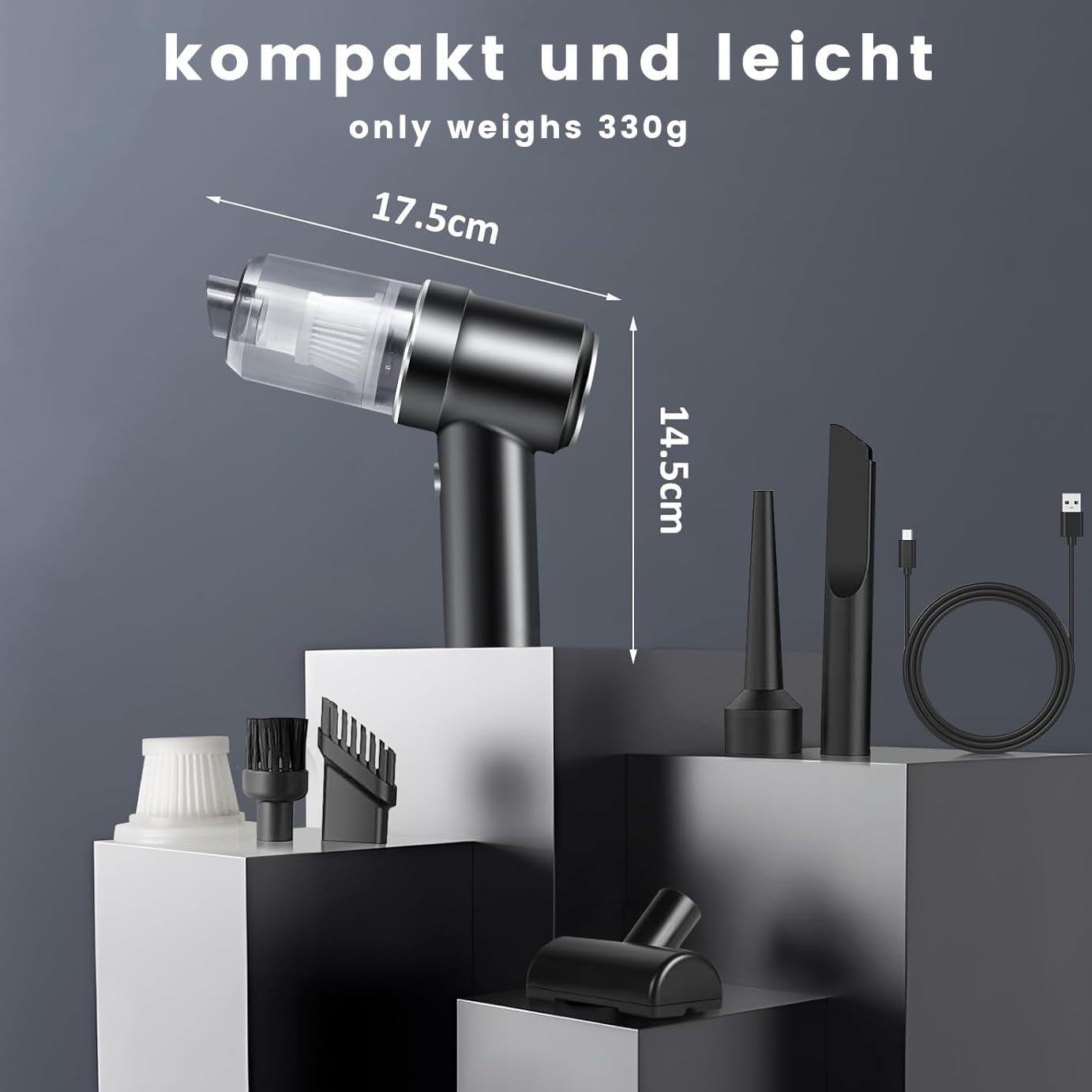 Rechargeable battery: the electric handheld vacuum cleaner battery test winner has a built-in 4000 mAh battery with a quick charging port. Reusable vacuum cleaner package includes a USB-C charging cable, so you can conveniently charge the vacuum cleaner in a car charger, mobile power, laptop, battery and other methods. The green indicator on the data cable can remind you in time that the power has been fully charged. It only takes 3 hours to charge.