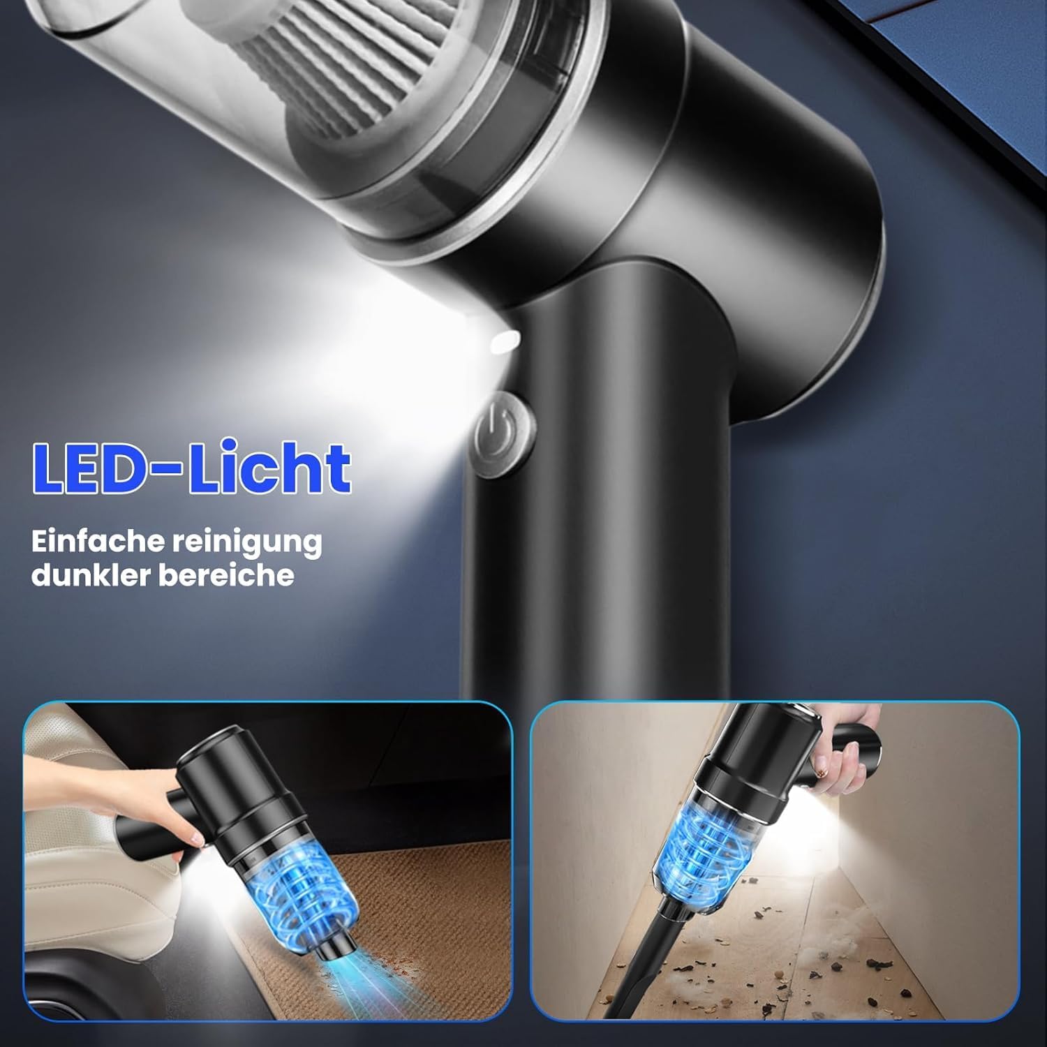 Portable and wireless design: this wireless car vacuum cleaner strong performance has an elegant design and weighs only 0.72 lbs, which allows easy operation, portability and storage. The wireless and one-button start design ensures effortless and quick cleaning in grout areas at home, office or in your car. It also has LED lighting so you can clean even in dark places or at night.