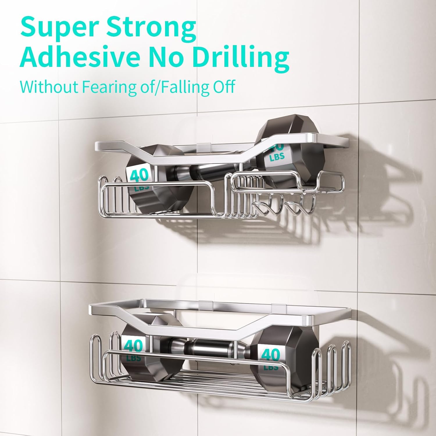- [Easy To Install]: The self adhesive shower shelves comes with transparent traceless glue is more durable and stronger than suction cup. No drilling or wall damage. The adhesive shower caddy also comes with an extra strip of hooks