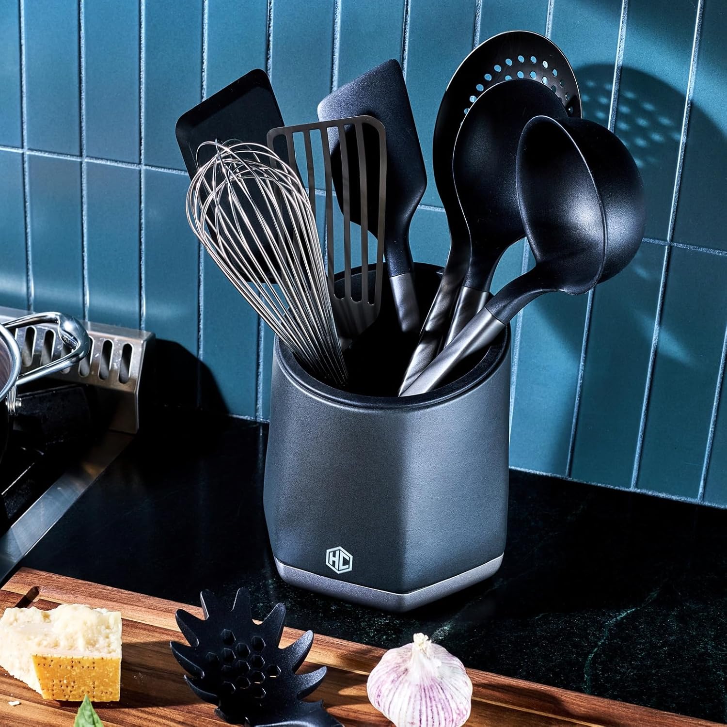HexClad 9-Piece Kitchen Utensil Set, 9 Stainless Steel & Silicone Tools with a Fingerprint-Resistant Metallic Finish, Heat-Resistant to 450°F, Dishwasher-Safe, Includes Non-Slip Ceramic Crock Holder