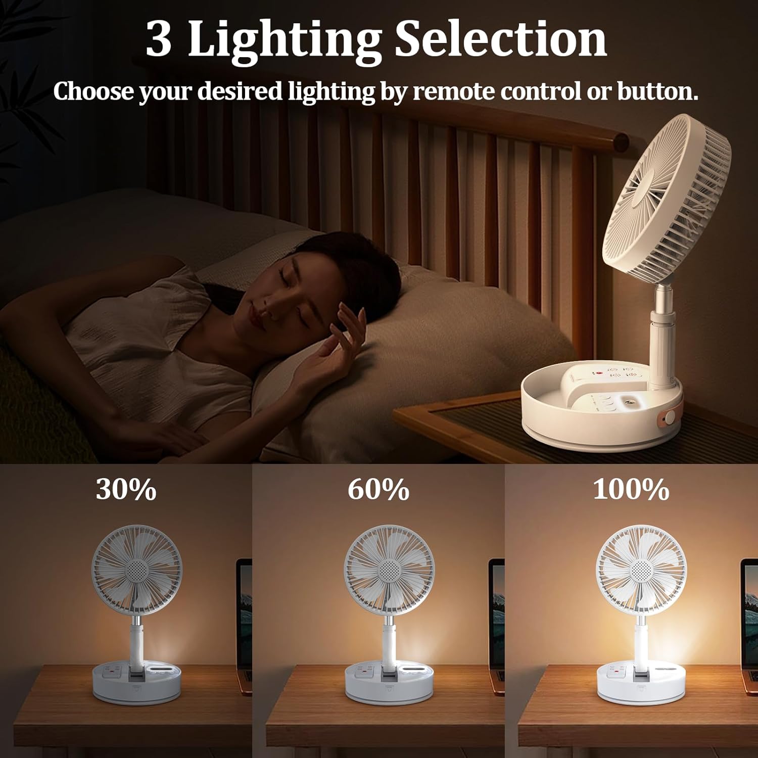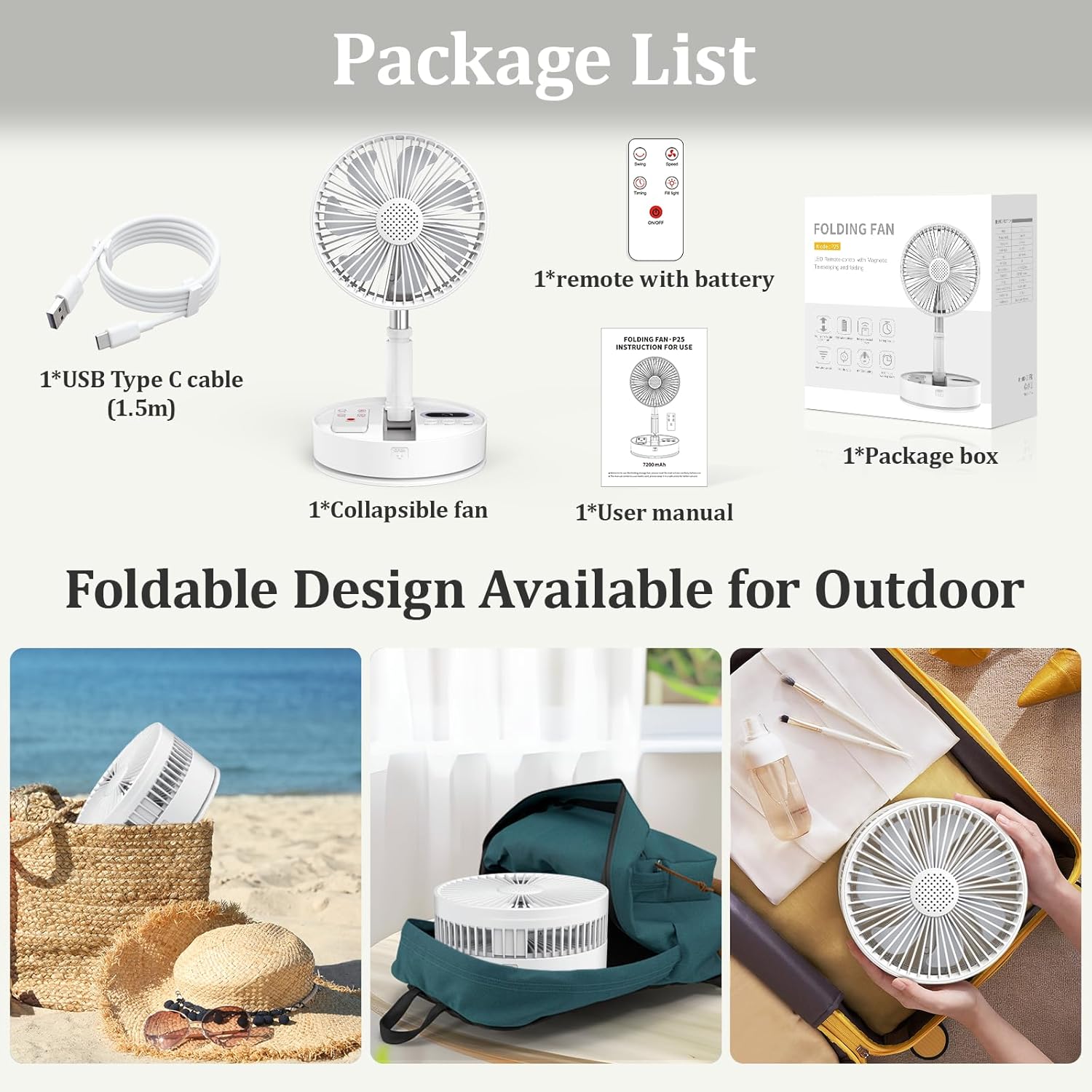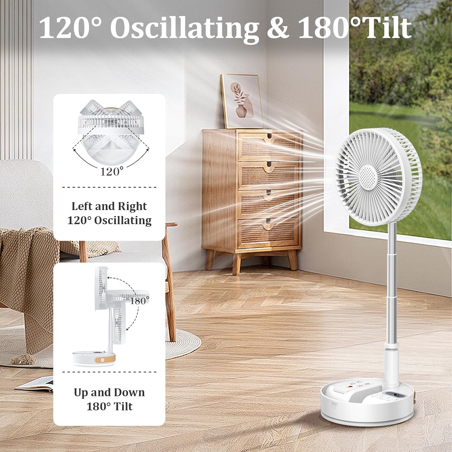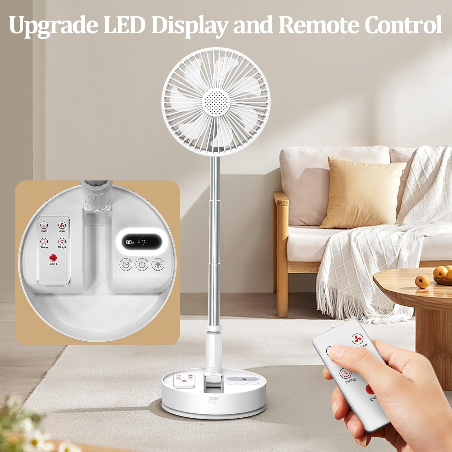 HHT Foldable Portable Standing Fan with Remote, 8" Rechargeable Floor Fan, 120° Quiet Oscillating Fan, 4 Speeds, LED Light, Timer, 7200mAh Battery, Adjustable Height Table Fan for Home Travel