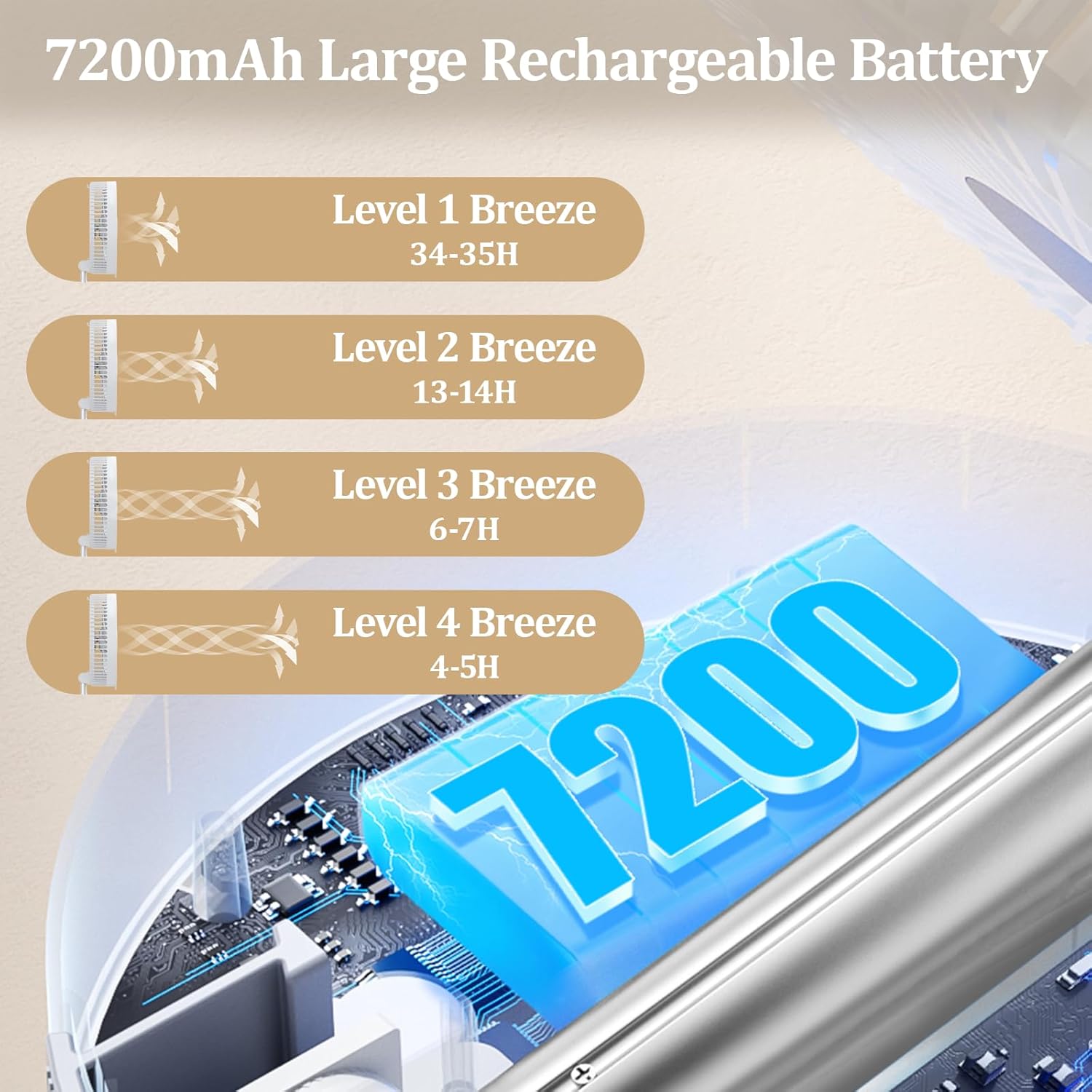 - 【Dual Power & 35 Hours Cordless Fan】 Bulit-in 7200mah rechargeable battery, support use while charging, or detach for cordless operation. Mighty battery delivers 8-35hrs runtime(depending on the wind speed), 4 hours to full charge. Includes 1.5m cable for travel-friendly charging.