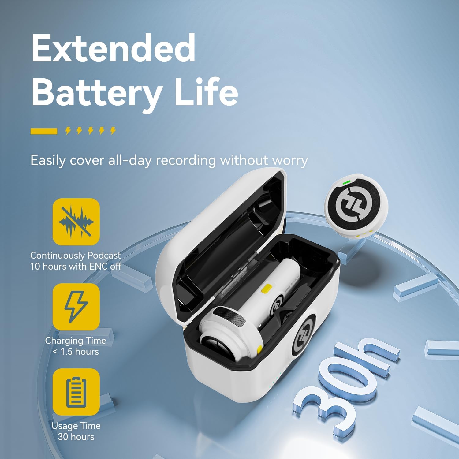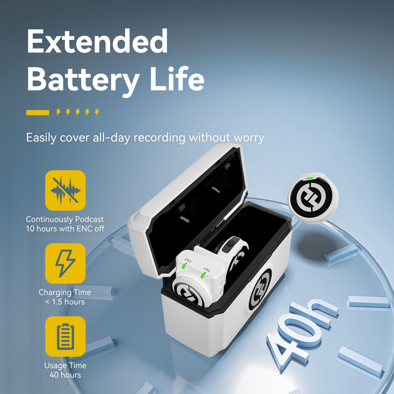 - [Extended 40-H Battery Life] With optimized power efficiency, the LARK M2 wireless microphone can work for up to 10 hours (with ENC off). The compact charging case can fully charge the entire set twice, and each charge takes less than 2 H. With the charging case, the camera version has a battery life of 40 H. No more worrying about low battery situation.