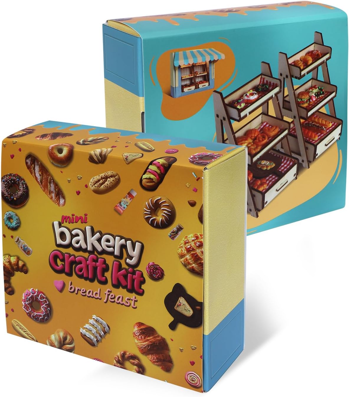 Everything you need to start your miniature masterpiece is included. With 150g of air-dry resin clay, 15 bakery molds, 8 color palettes, 7 simulated jam colors, and 4 topping bottles, the creative options are endless. Two wooden display shelves, trays, price tags, and a mini bakery store window with lighting complete your charming setup.
