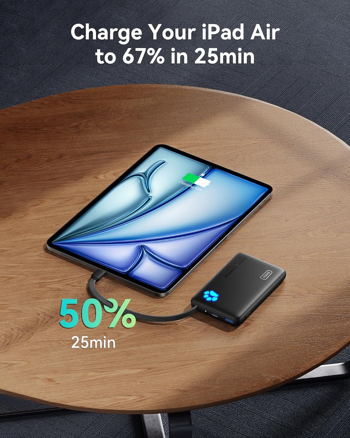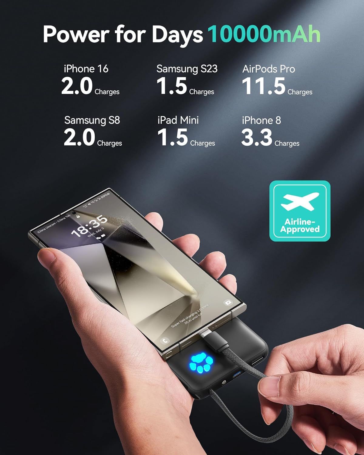 - Grab & Go, No Extra Wires Needed: This 10000mAh power bank features a built-in USB-C cable that charges both your phone and the power bank and doubles as a lanyard. Leave home without extra cables.