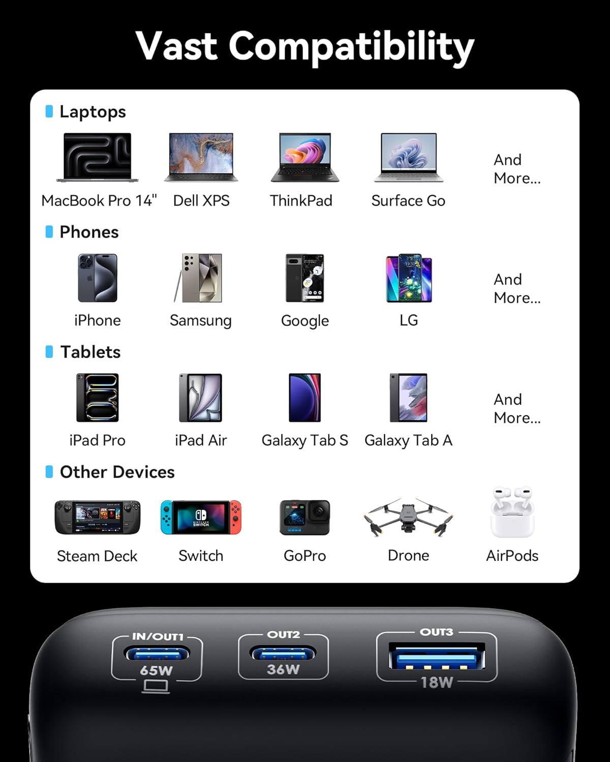 - Power Ready iPhone & MacBook in 25Mins: A must-have for multi-device users, this power bank provides up to 65W high-speed charging for two devices simultaneously. In just 25 minutes, it can charge your MacBook Air 13" to 41% and iPhone 15 to 56%. It also supports Samsung Super Fast Charging 2.2.