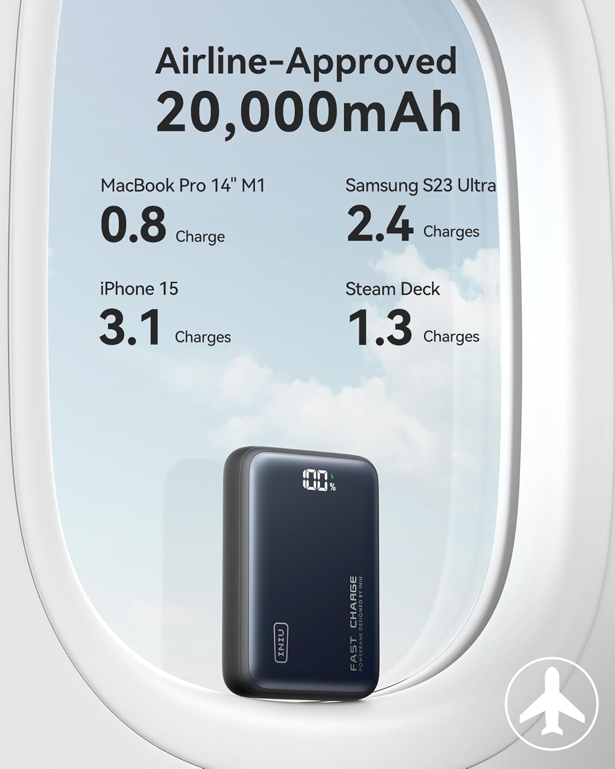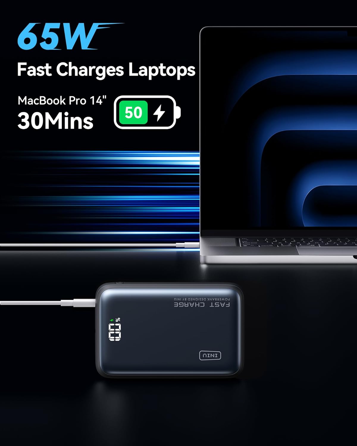 - ✅【Market's Smallest 65W 20000mAh】Equipped with iNiu's industry-first high-density TinyCell and groundbreaking HyperStack technology, this TSA-Compliant power bank breaks the size limits of high-capacity chargers. No more bulky bricks, just compact portability for worry-free travel.