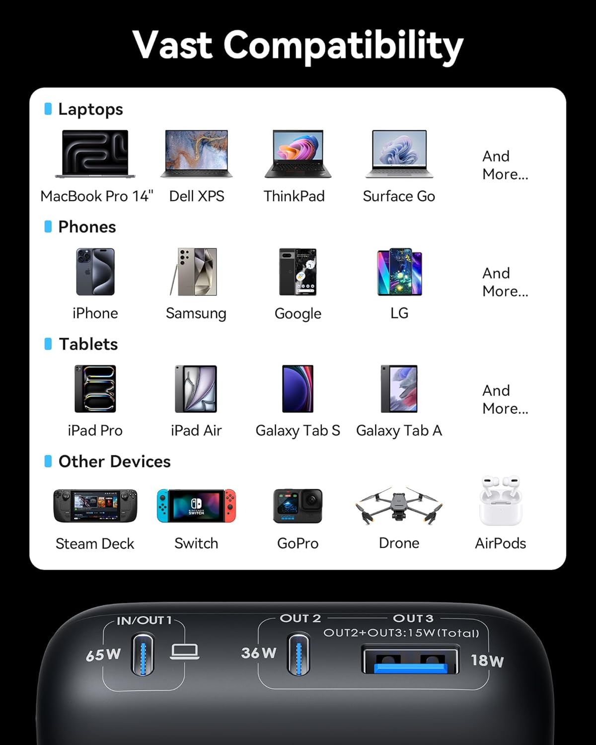 - ✅【Power Ready iPhone & MacBook in 30Mins】A must-have for multi-device users, this power bank provides up to 65W high-speed charging for 2 devices at once. In just 30 minutes, it can charge your MacBook Air M1 to 51% and iPhone 15 to 71%.