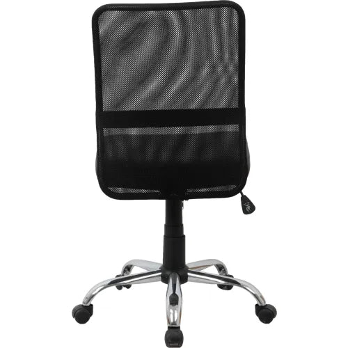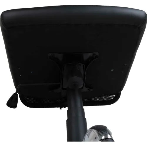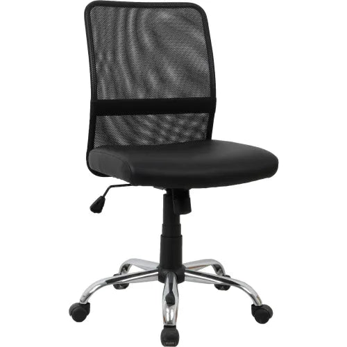 This task chair features commercial grade mesh that is wrapped around the frame for a clean, streamlined look. Black PU Leather is upholstered around a 3-1/4" thick foam cushion. Heavy duty chrome base and casters offer both support and an upgraded aesthetic design. Adjustable height with tilt tension control and tilt lock.