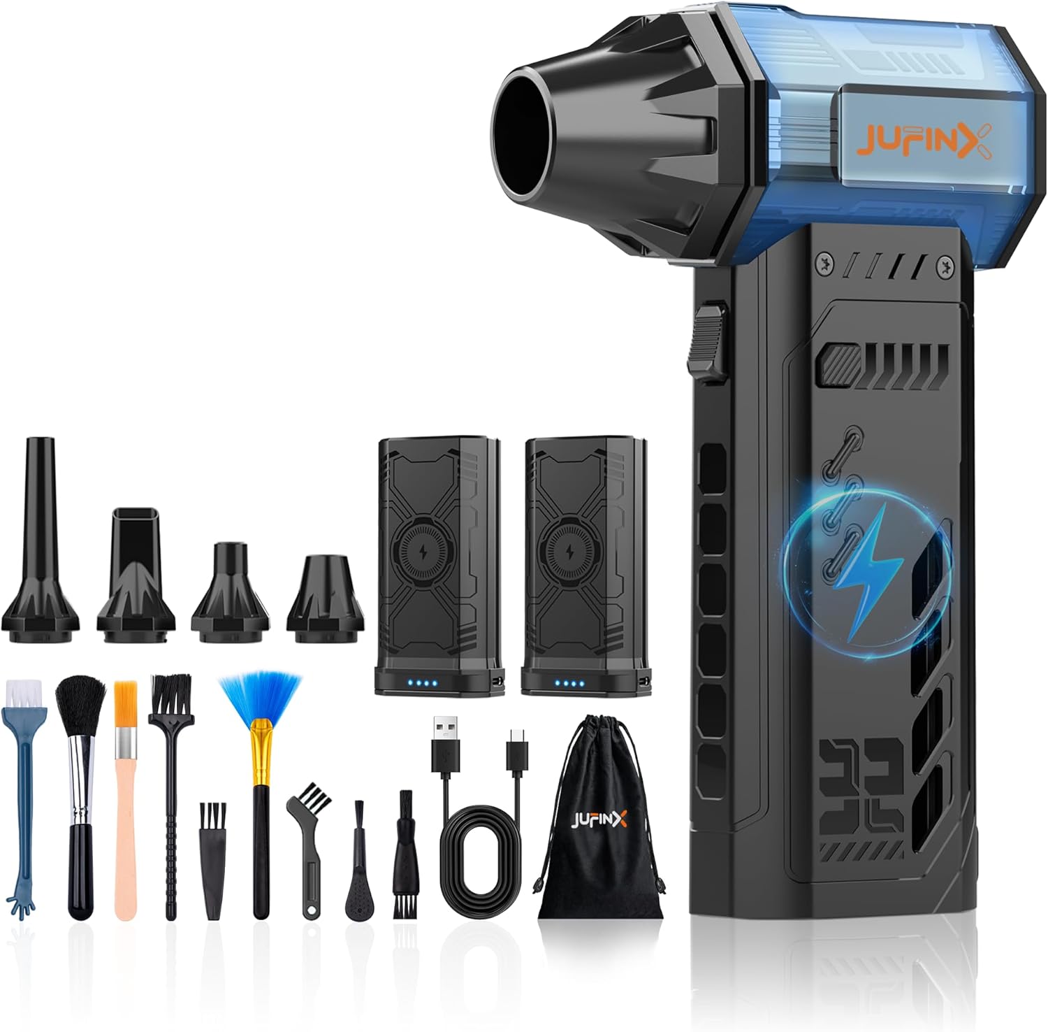 Versatile Cleaning Tool: Featuring 4 nozzles the JUFINX electric air duster is perfect for cleaning electronics like PCs and keyboards, as well as for home, Leaves, car, and outdoor use. It’s also great for inflating gear or managing campfires, making it a must-have for multiple scenarios.