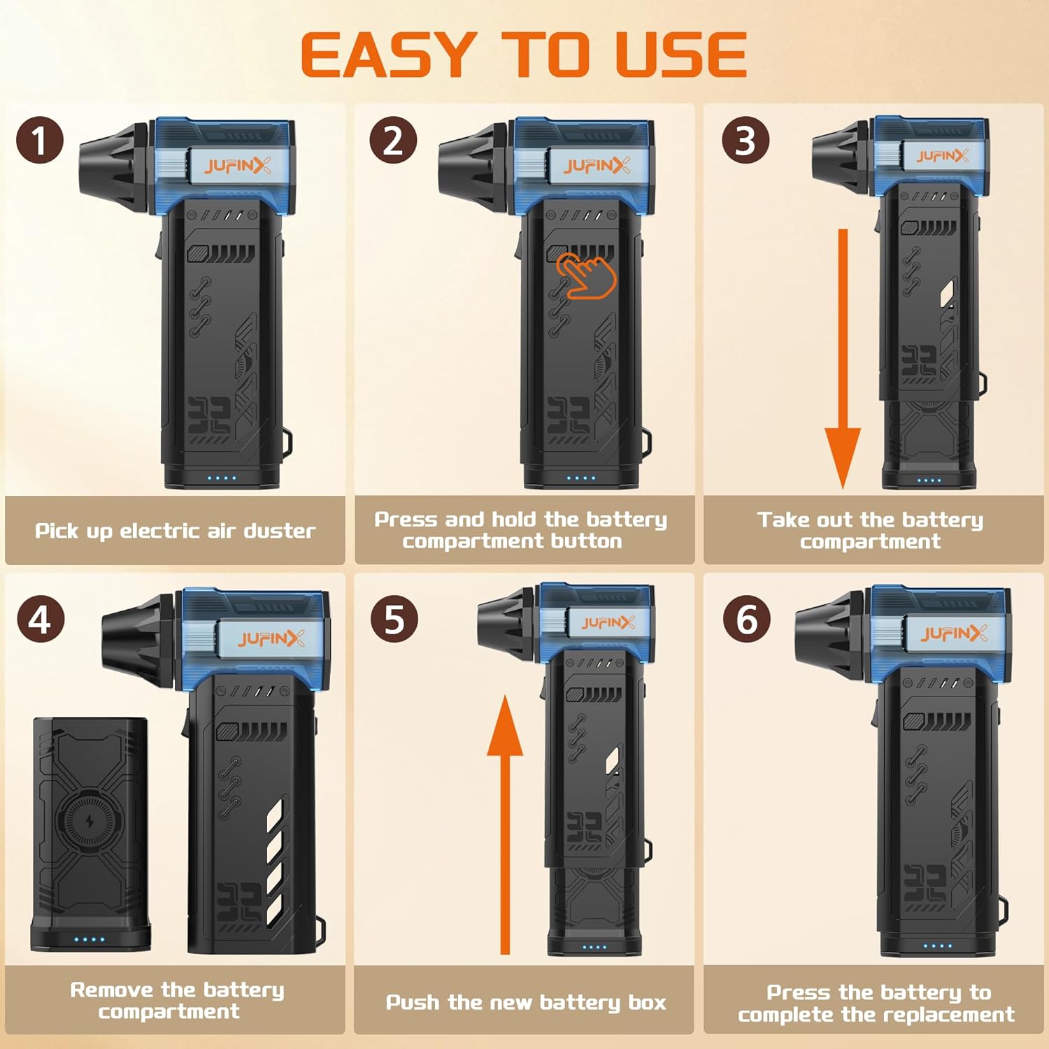 Reuse and Cost-Efficiency: Made from durable materials, the JUFINX air duster offers a long battery life and can be reused. It’s a sustainable and economical alternative to single-use compressed air cans, much better choice for your wallet and the planet.