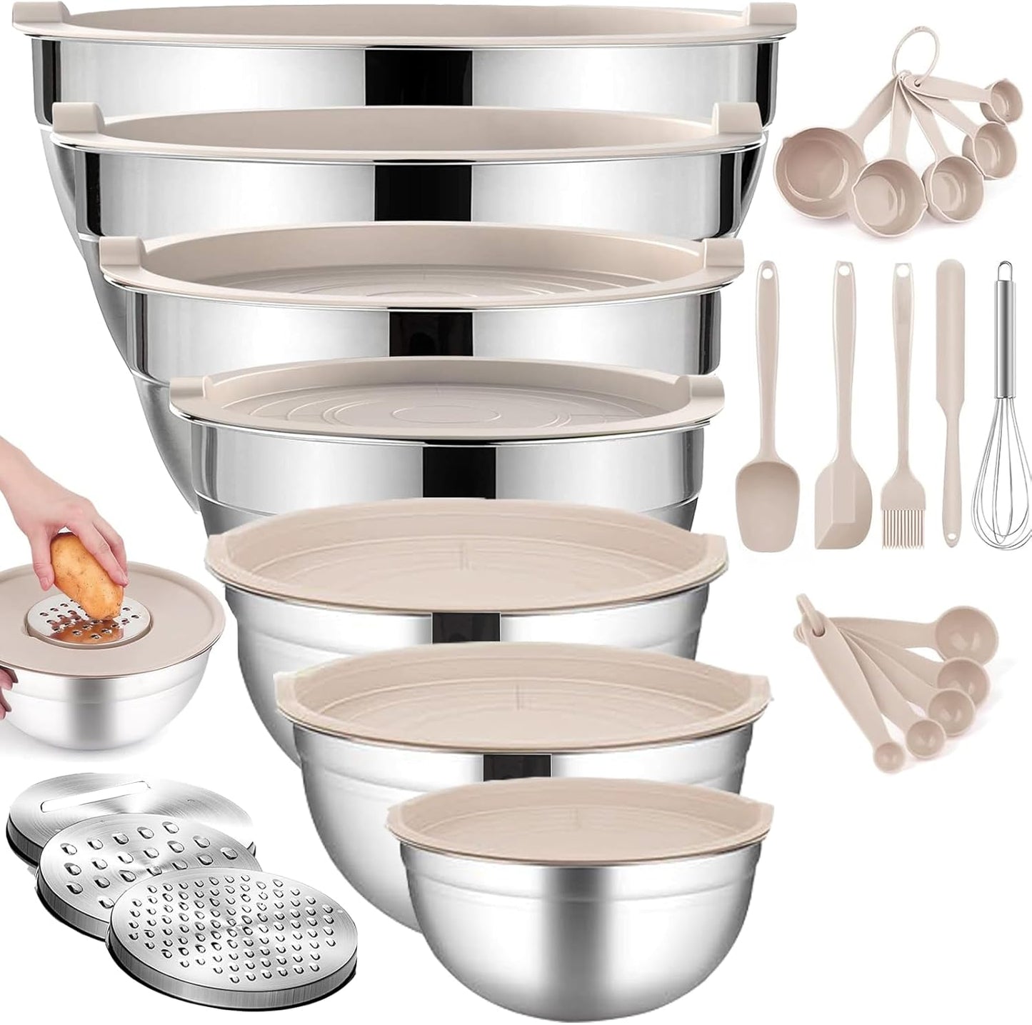 JUJOJB Mixing Bowls With Lids Set,Stainless Steel Mixing Bowls Set With 3 Grater,Metal Nesting Bowls For Kitchen Baking Refrigerator Meal Prep Food Storage Organizer,7 Size(Khaki)