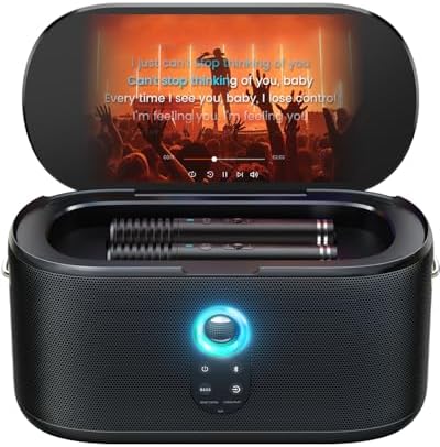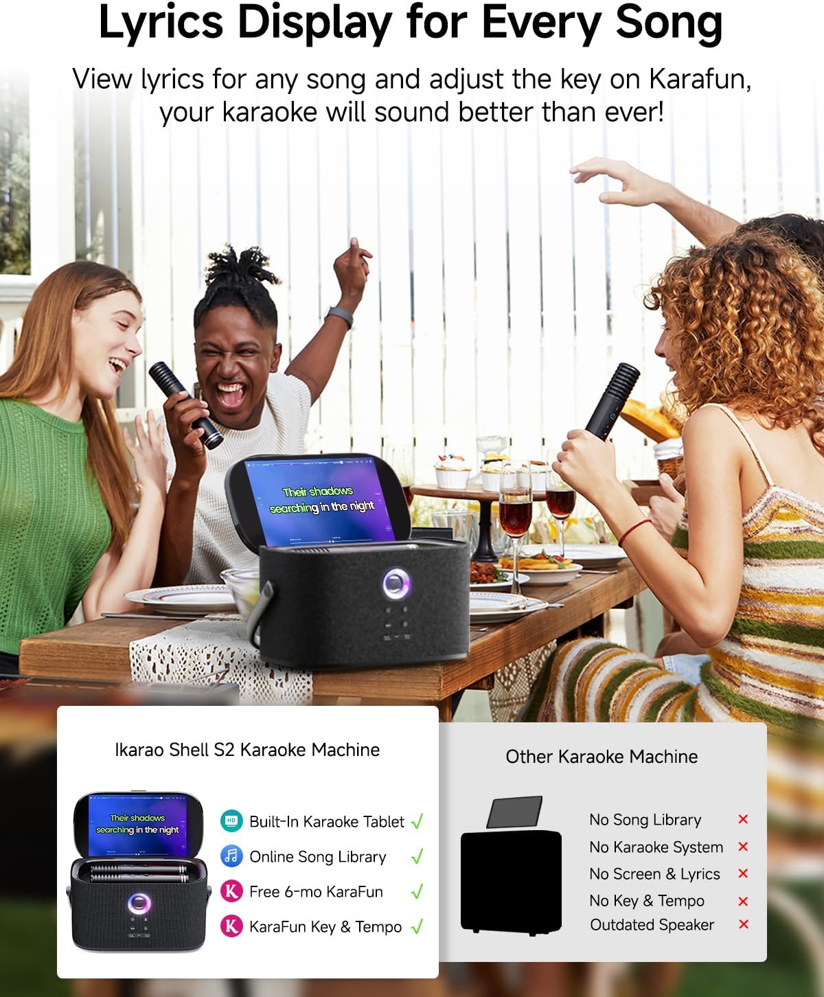 - Ultimate All-in-One Karaoke Experience - Elevate your karaoke sessions with the Ikarao karaoke machine featuring a built-in screen and preloaded KaraFun (Apps for Singing. Thousands of Karaoke Songs) software with a 6-month membership. Enjoy seamless singing without additional devices. Equipped with 2 Bluetooth wireless microphones for crystal-clear vocals with adjustable EQ effects, this karaoke machine with screen is perfect for parties, family gatherings, or solo practice