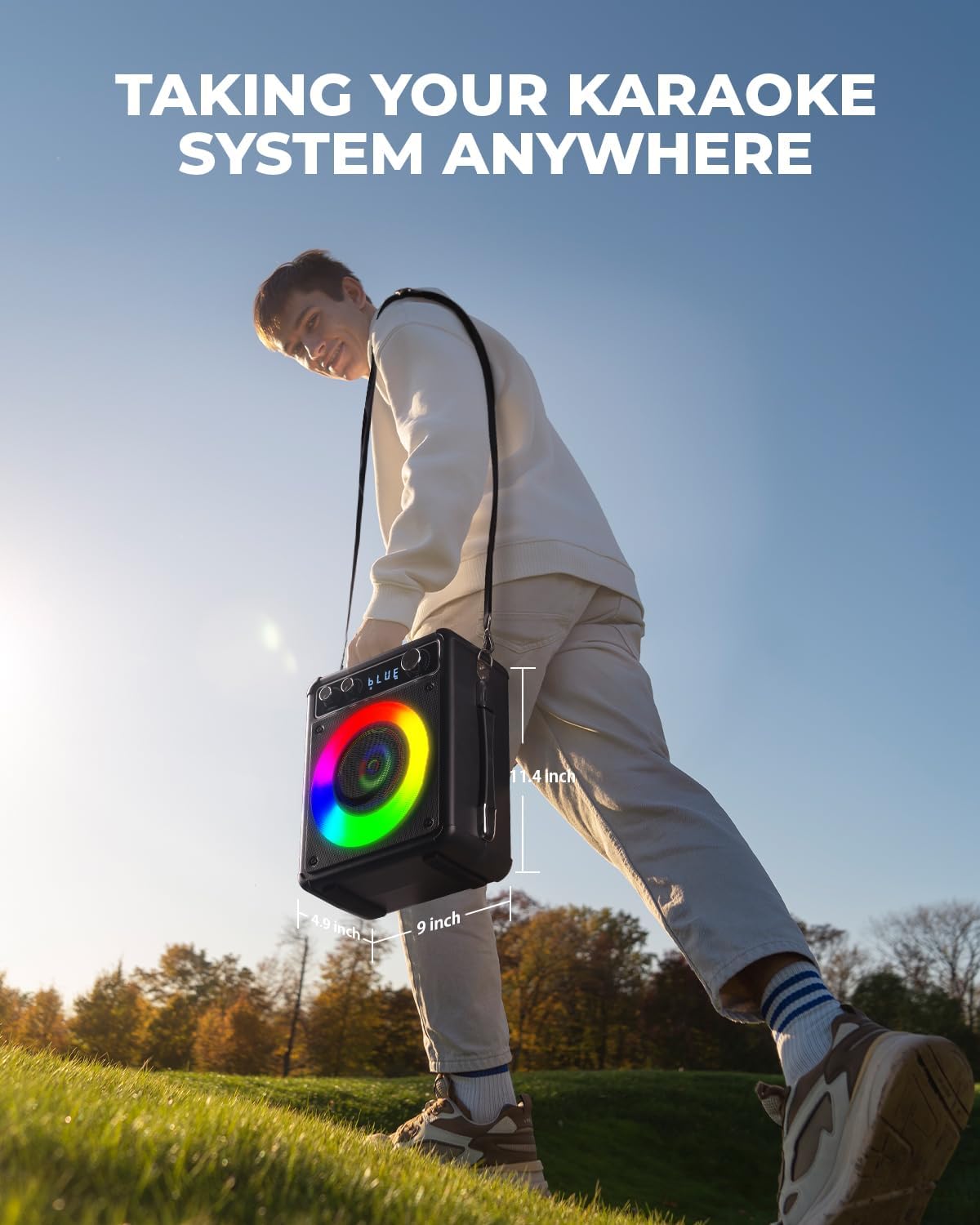 • ๐”๐ฅ๐ญ๐ข๐ฆ๐š๐ญ๐ž ๐๐จ๐ซ๐ญ๐š๐›๐ข๐ฅ๐ข๐ญ๐ฒ: Take the party wherever you go with the portable outdoor speaker. Featuring a leather carry handle and a shoulder strap, it's easy to carry around. Plus, with its fully charge, you can enjoy 4-6 hours of non-stop singing, making it perfect for outdoor gatherings, upstairs parties, or even on-the-go karaoke sessions.