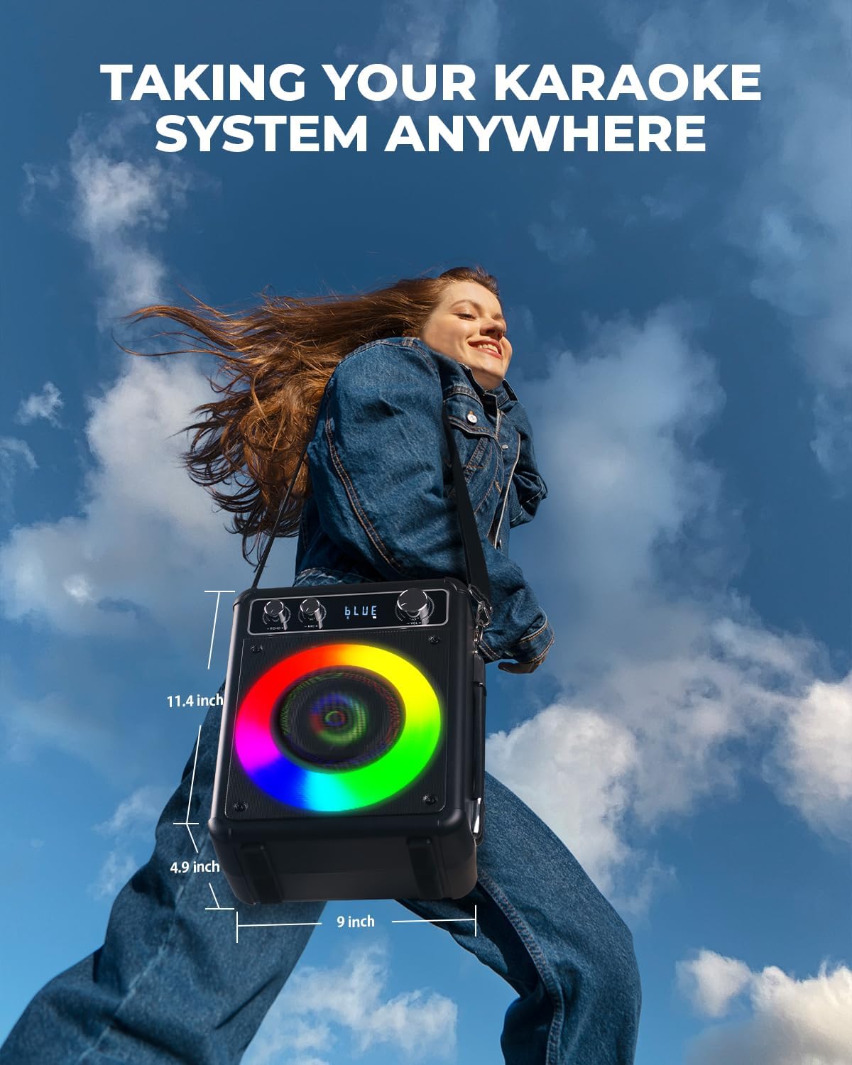 Karaoke Machine, Portable Bluetooth Speaker with 2 Wireless Microphones, PA System for Adults Kids with LED Lights, Supports REC/FM/AUX/USB/TF for Home Party