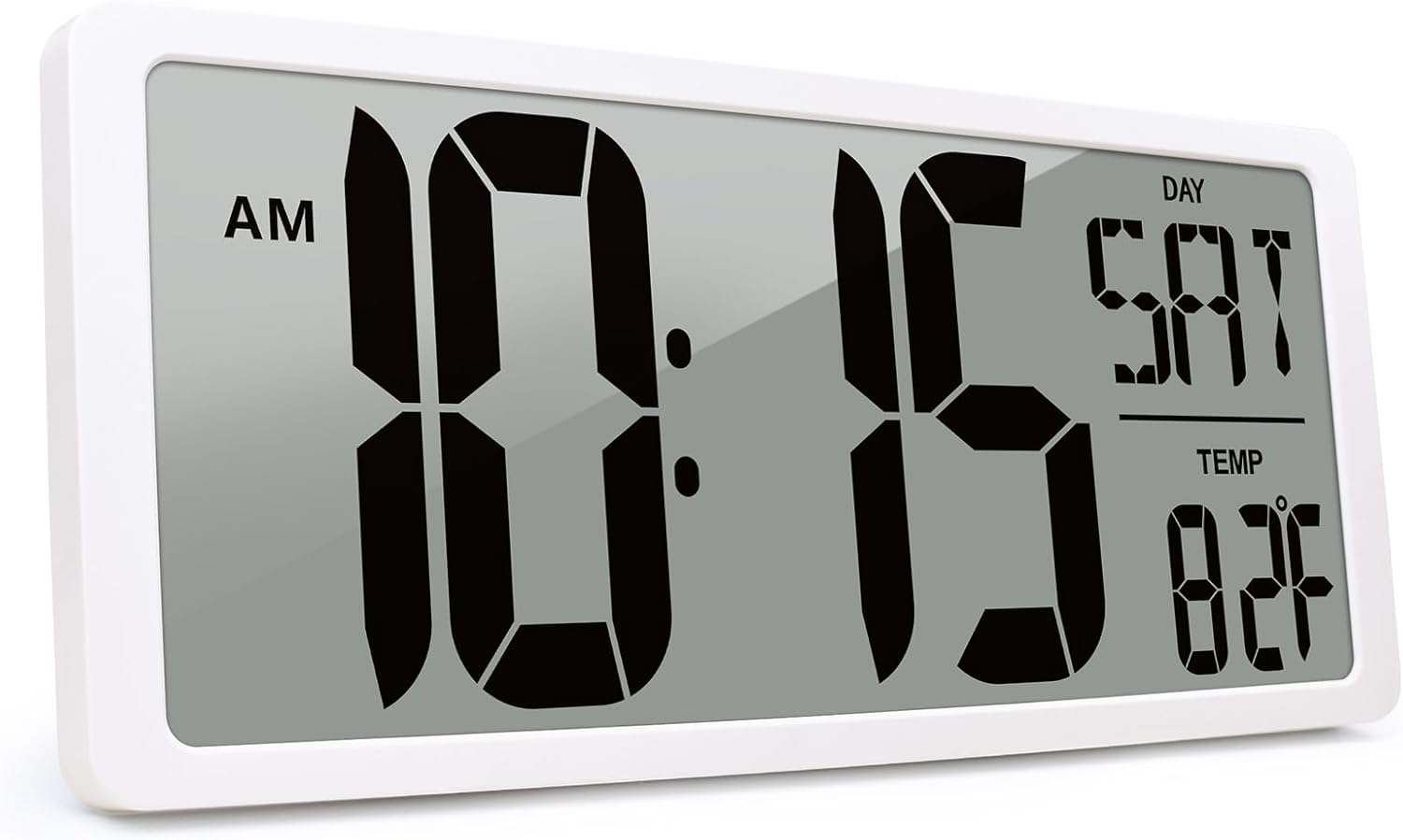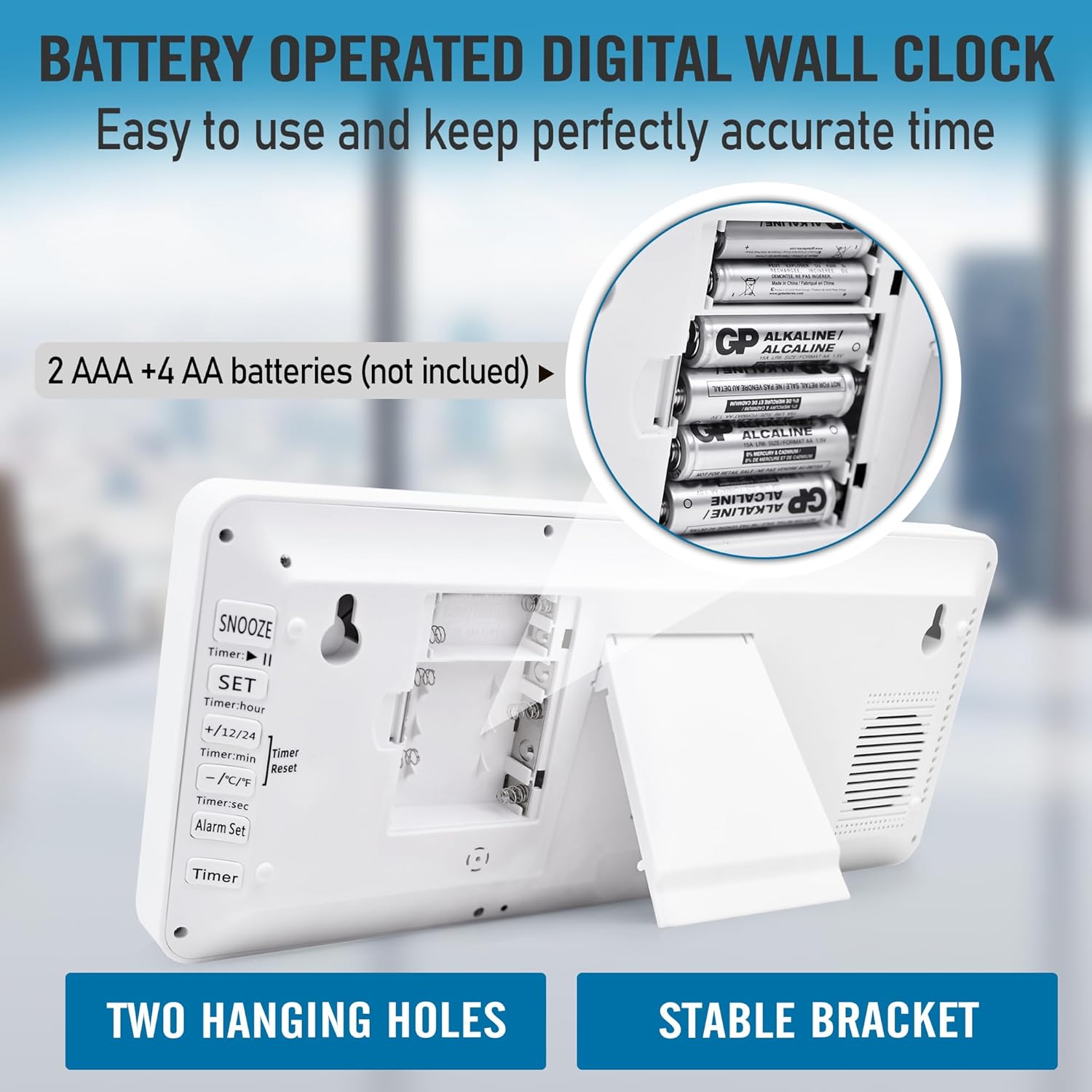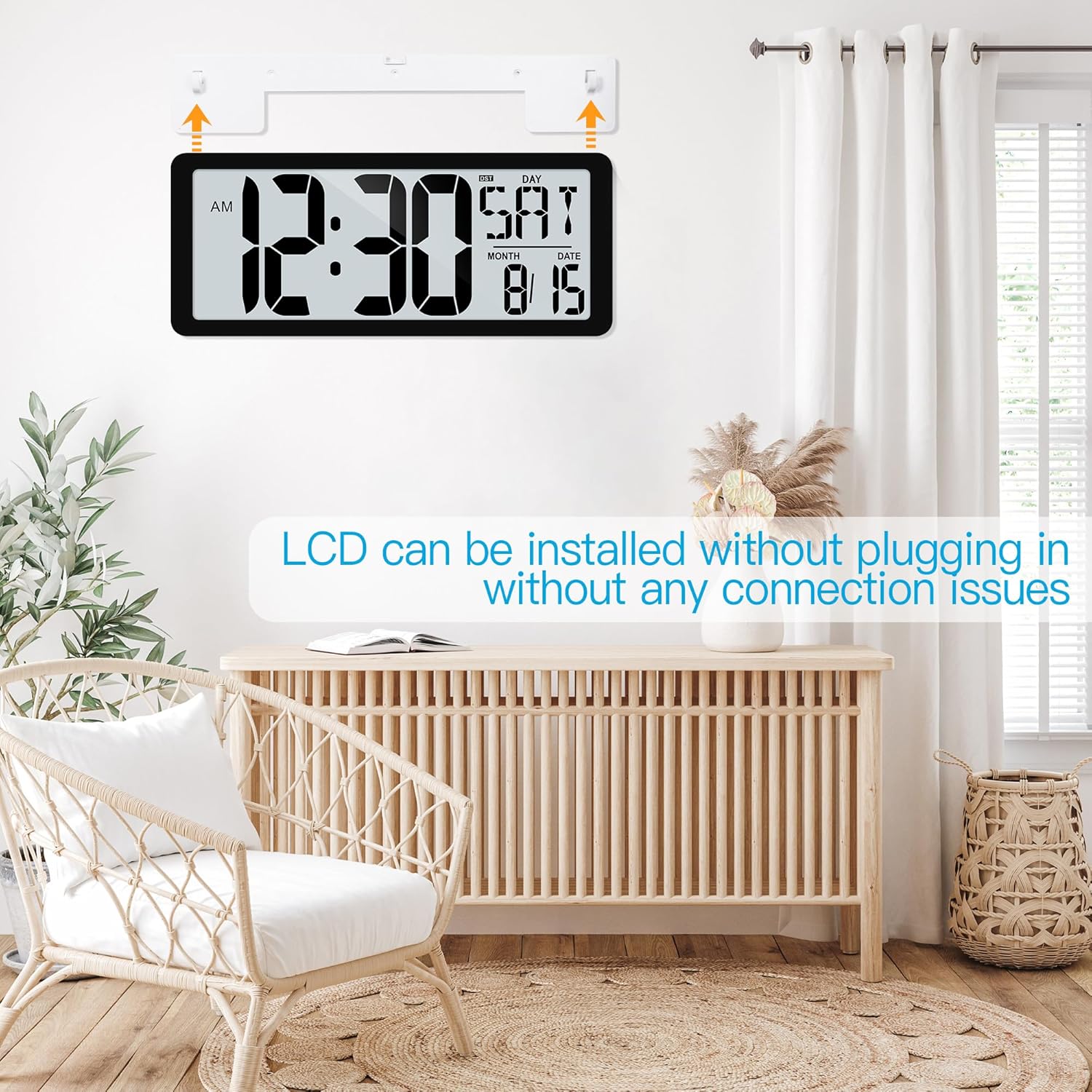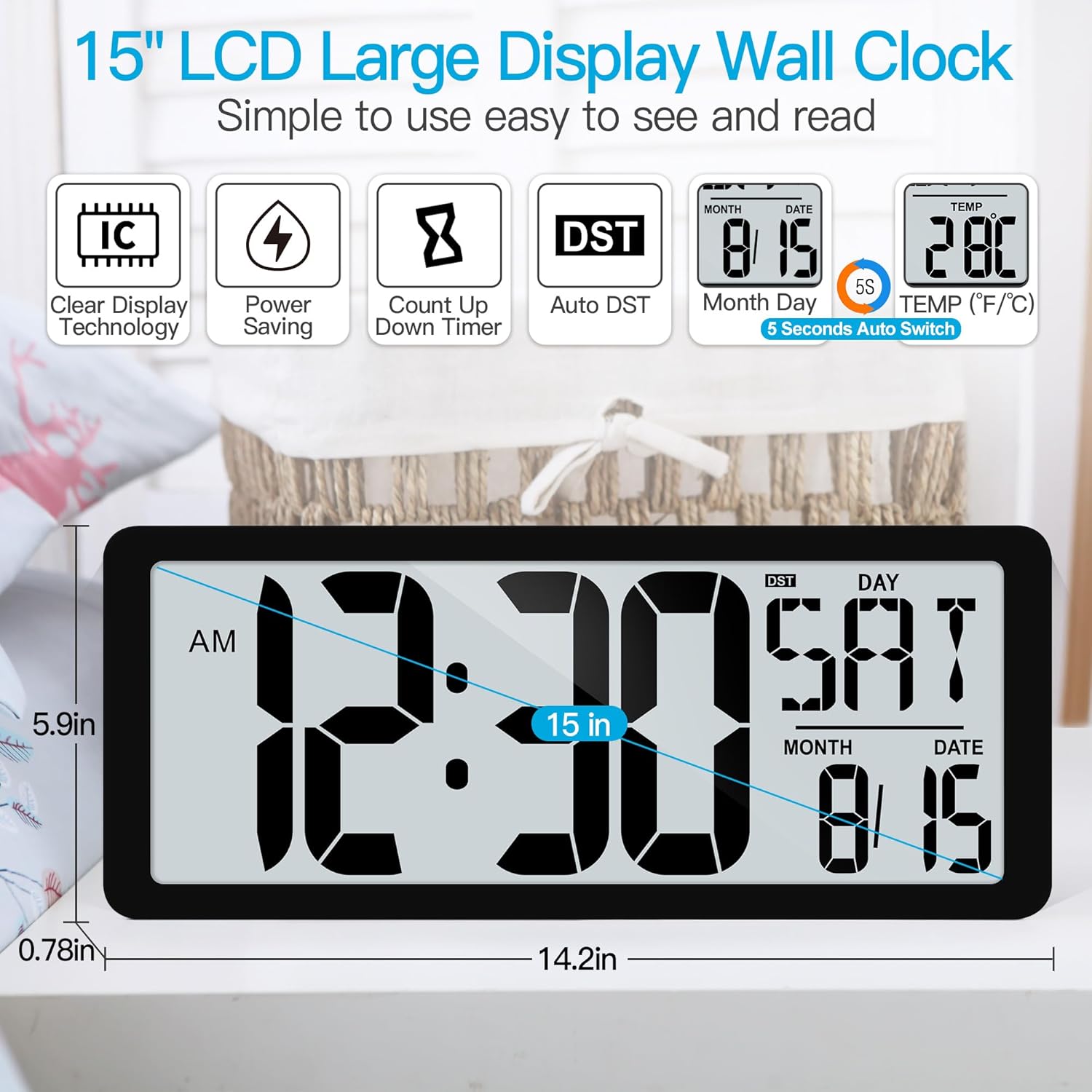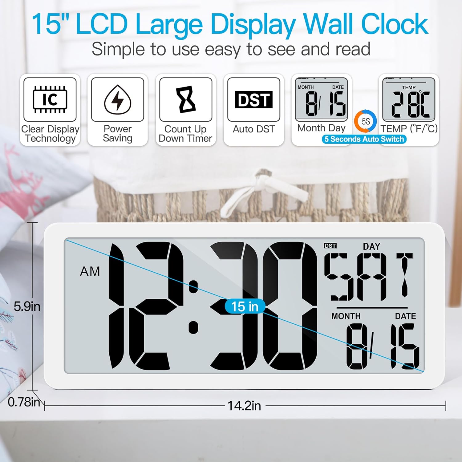 KMMKGG 15" Large Digital Wall Clock Battery Operated, Digital Clock Large Display with Day, Date & Temperature, Large Wall Clock for Bedroom, Livingroom, Office,Battery Included