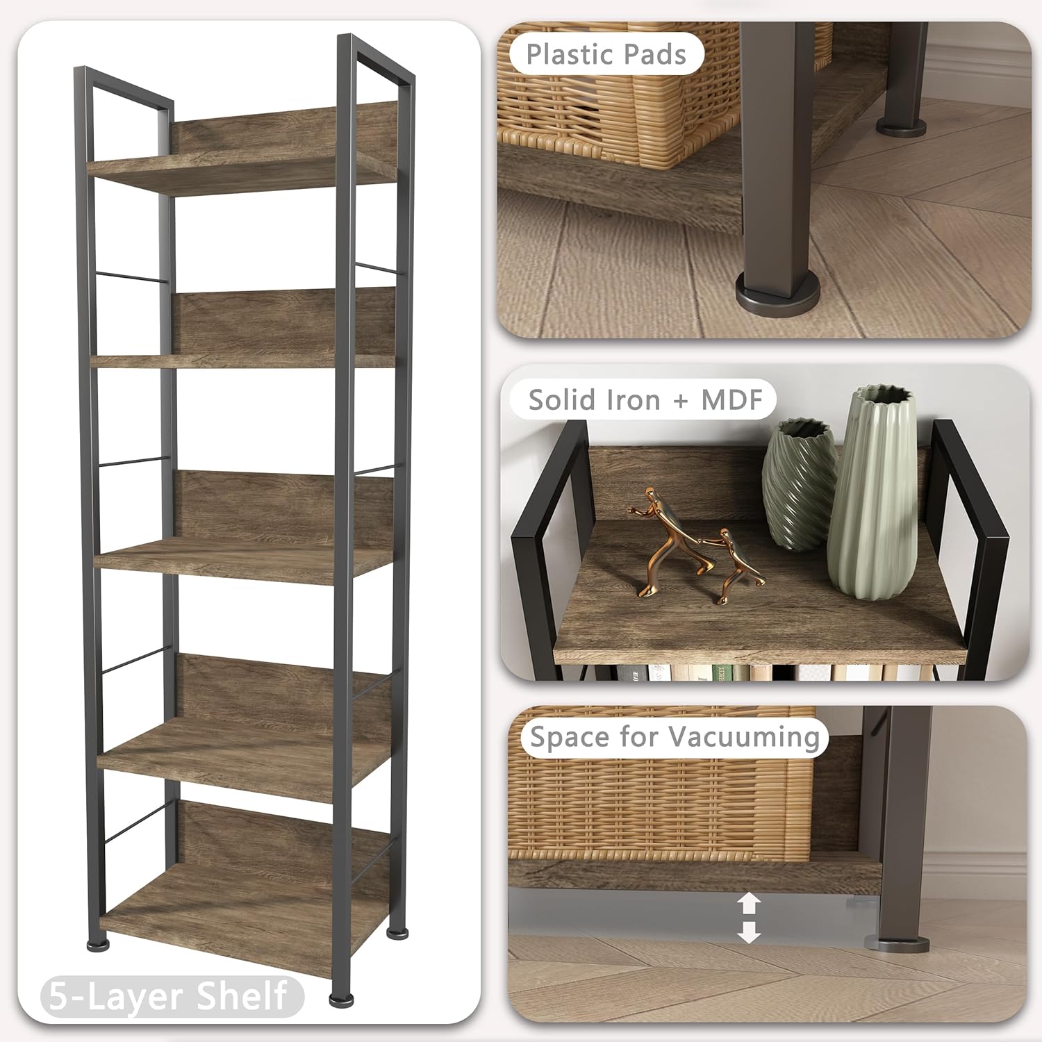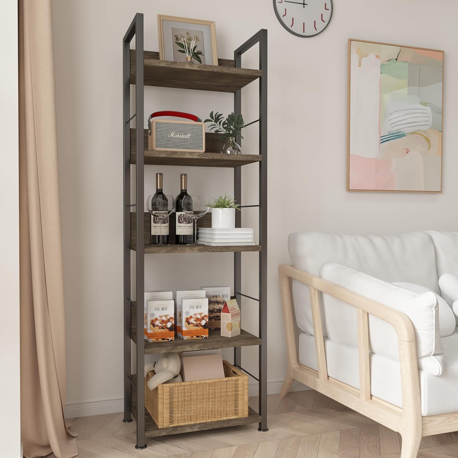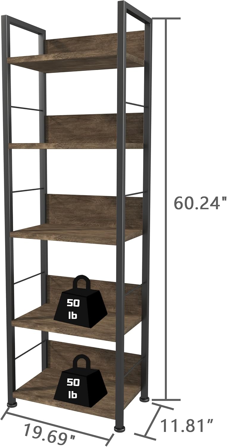 KZZLOL Bookshelf 5 Tier, Corner Bookcase with MDF Board & Metal Frame, Industrial Book Shelf Decor for Living Room, Study, Kitchen ,Bedroom Storage (Dark Brown)