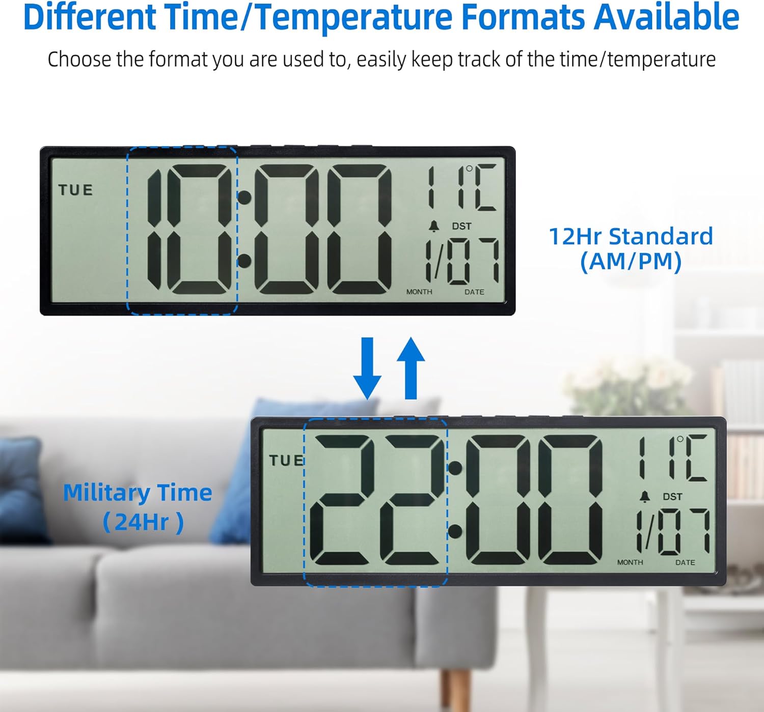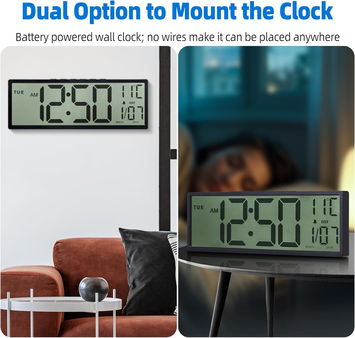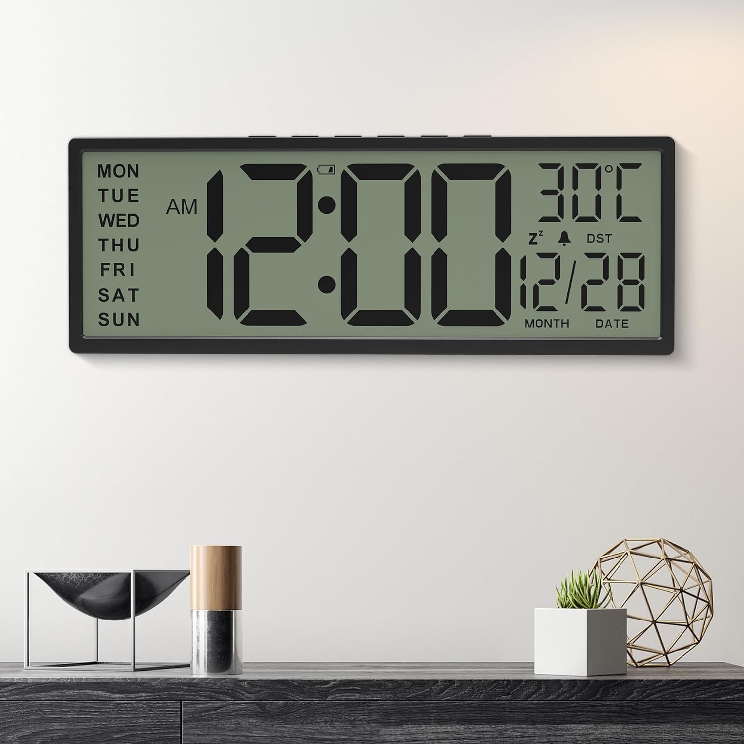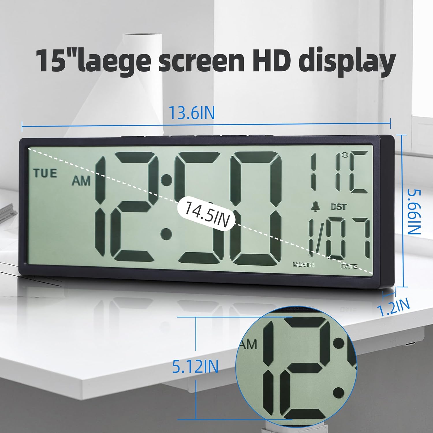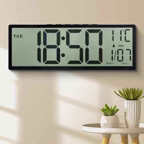 Purilite Select 15.5" Large Digital Wall Clock – Battery Operated, Auto DST, Indoor Temperature & Date Display, for Wall or Desk Use