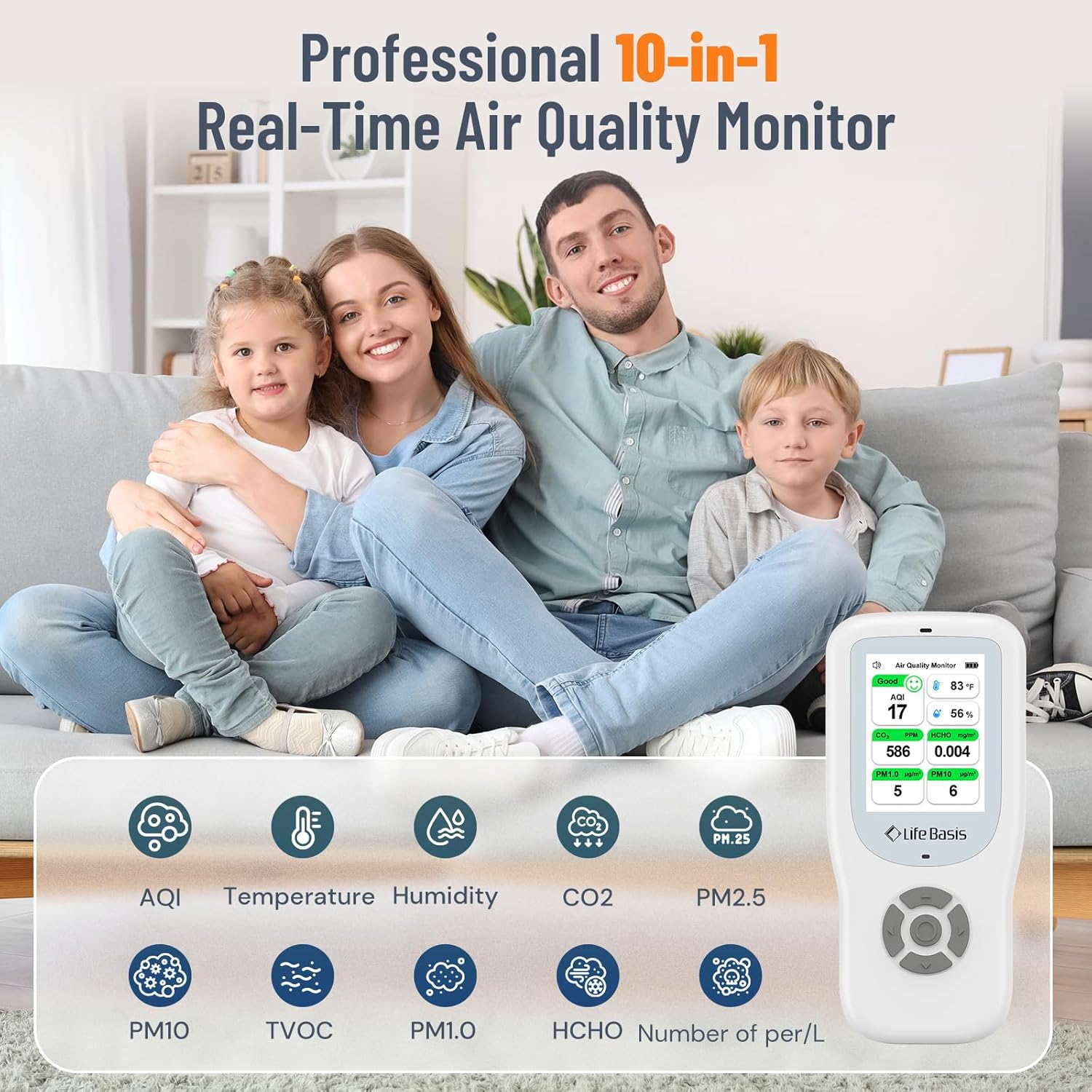 • MULTIFUNCTION MONITORING: This indoor air quality monitor provides real-time monitoring of 10 crucial indexes including AQI, CO2, PM1.0, PM2.5, PM10, Particles, HCHO, TVOC, temperature and humidity. Life Basis air quality monitor keeps you informed of current air quality levels at all times to guarantee the breath health of your family