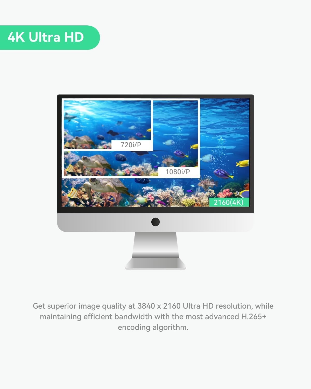 - 4K ULTRA HD UNDERWATER INSPECTION - Presenting 8 Megapixels (3840x2160) vivid video with 4x more details than regular HD camera; wide view angle; Efficient bandwidth control with the advanced H.265 compression;