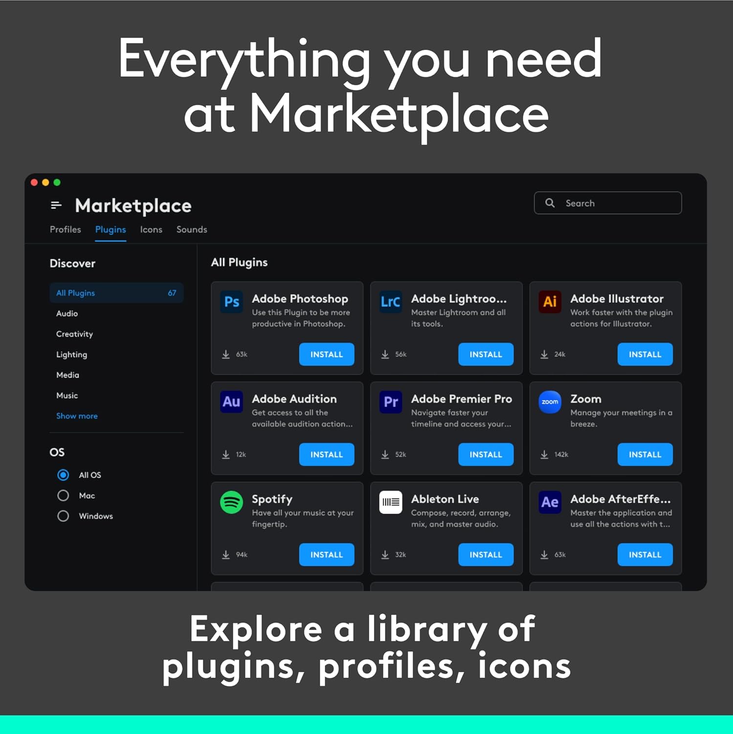 Discover More on Marketplace: Find a growing library of actions and plugins, recommended profiles, icon packs, and more on the marketplace in the Logi Options+ app (2)