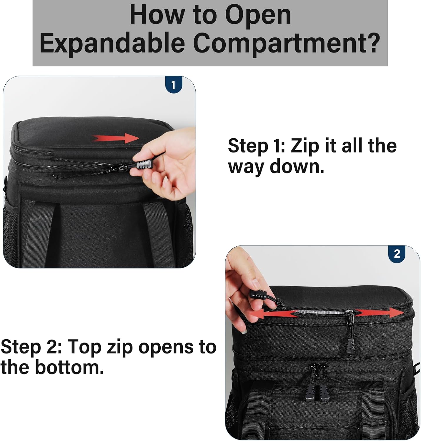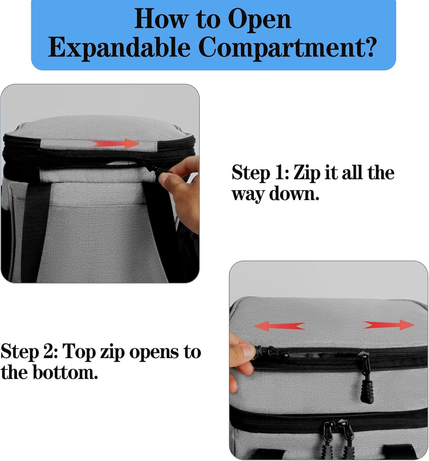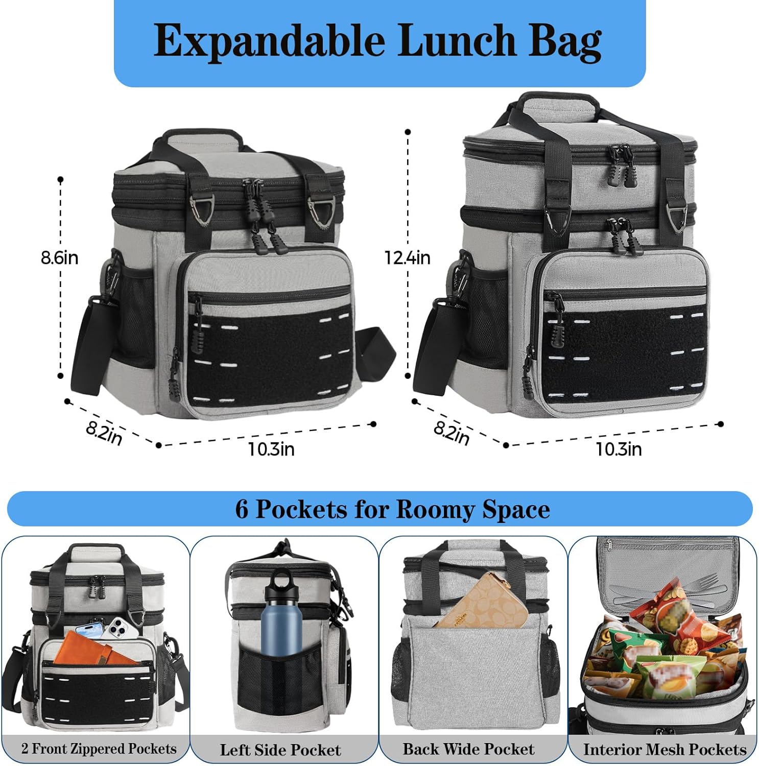- Dual Compartment for Dry or Wet Separated: Expandable top compartment, you can easily adjust the storage space to accommodate your meals, drinks, and fruits for the day. The top section is great for dry foods, just unzip to expand to make the section/compartment bigger.