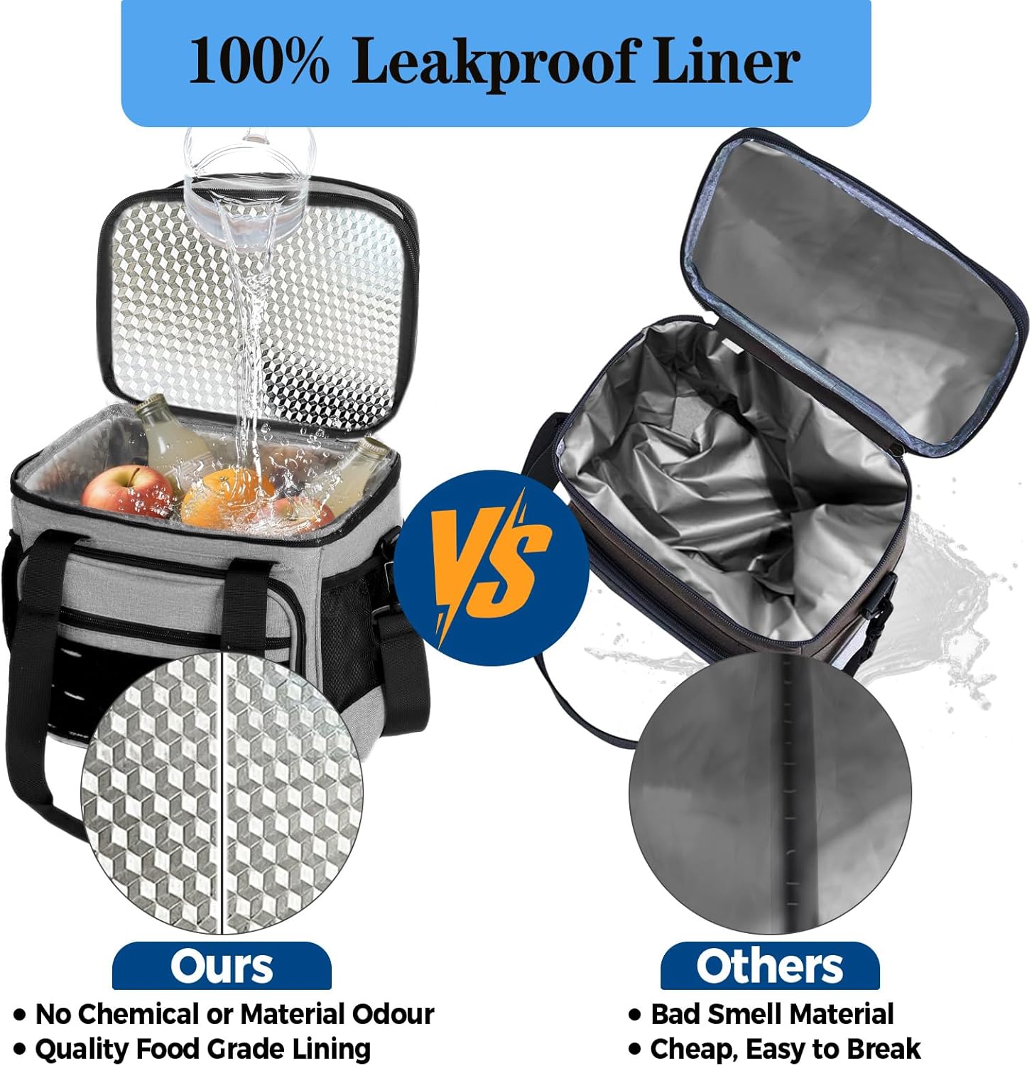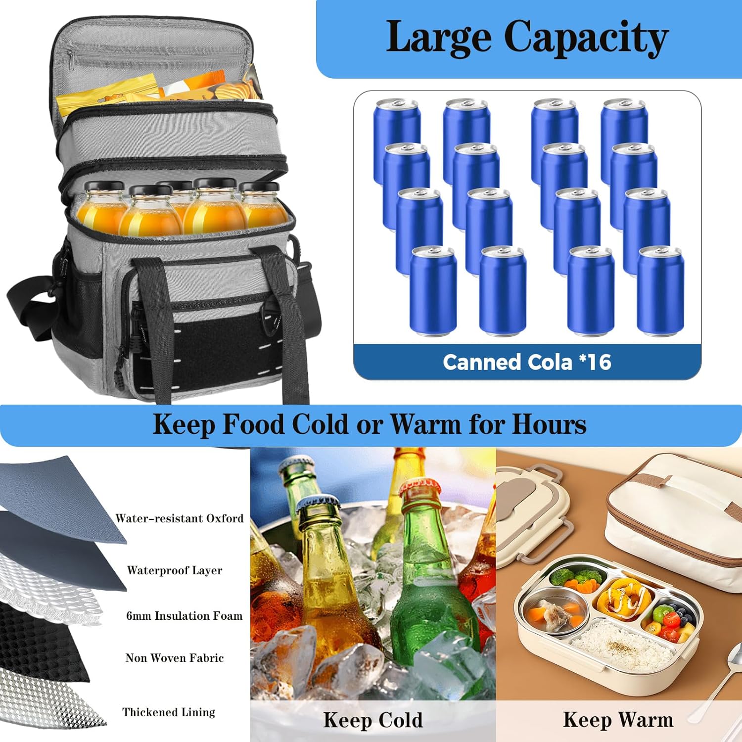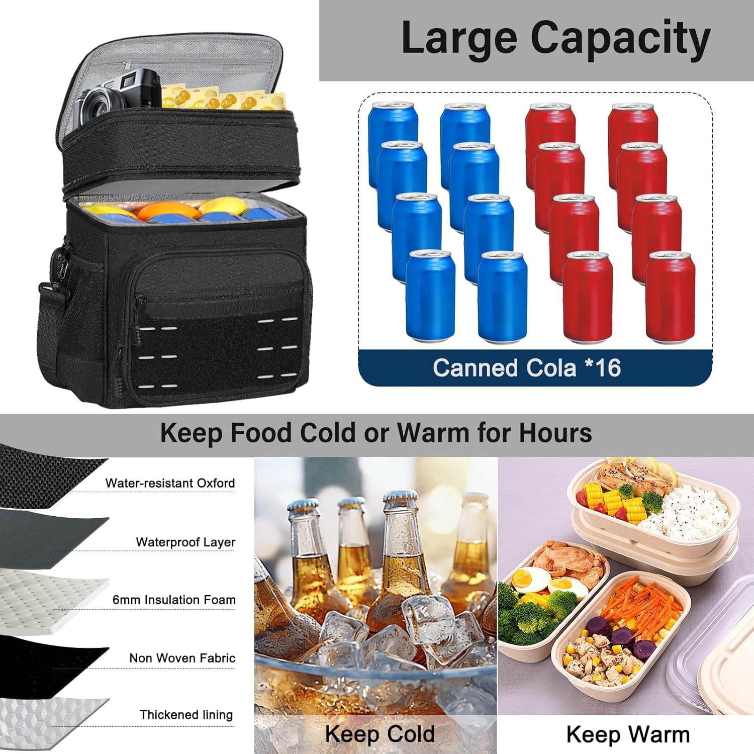 - Durable and Heavy-duty Design: Adopted 6mm thicker outer oxford fabric with strong stitching which makes the cooler bag tough to withstand daily use and outdoor adventures without showing signs of wear and tear. Design with a reinforced structure, the lunch bag is enough to stand up on its own when empty. This insulated lunch bag is suitable for drivers, construction workers, or camp counselors.