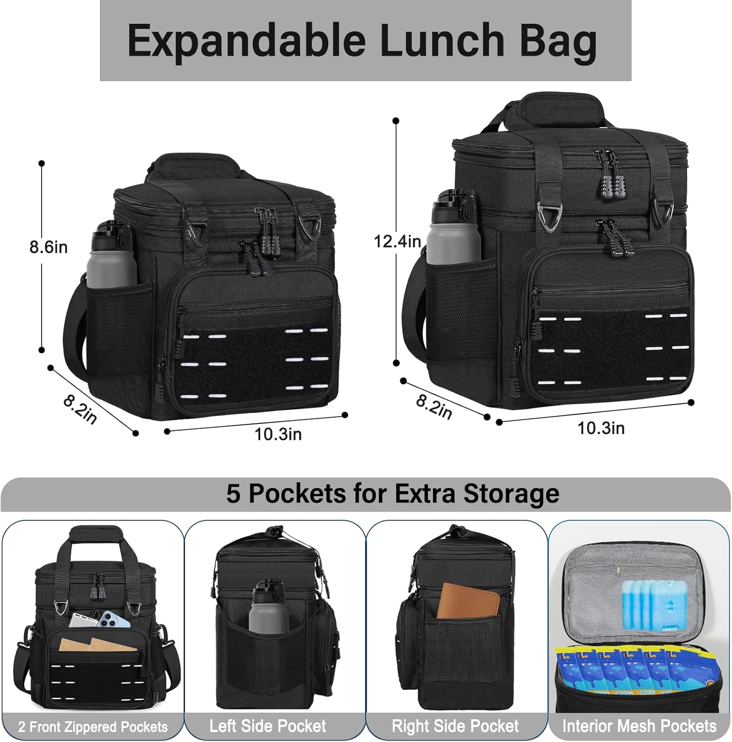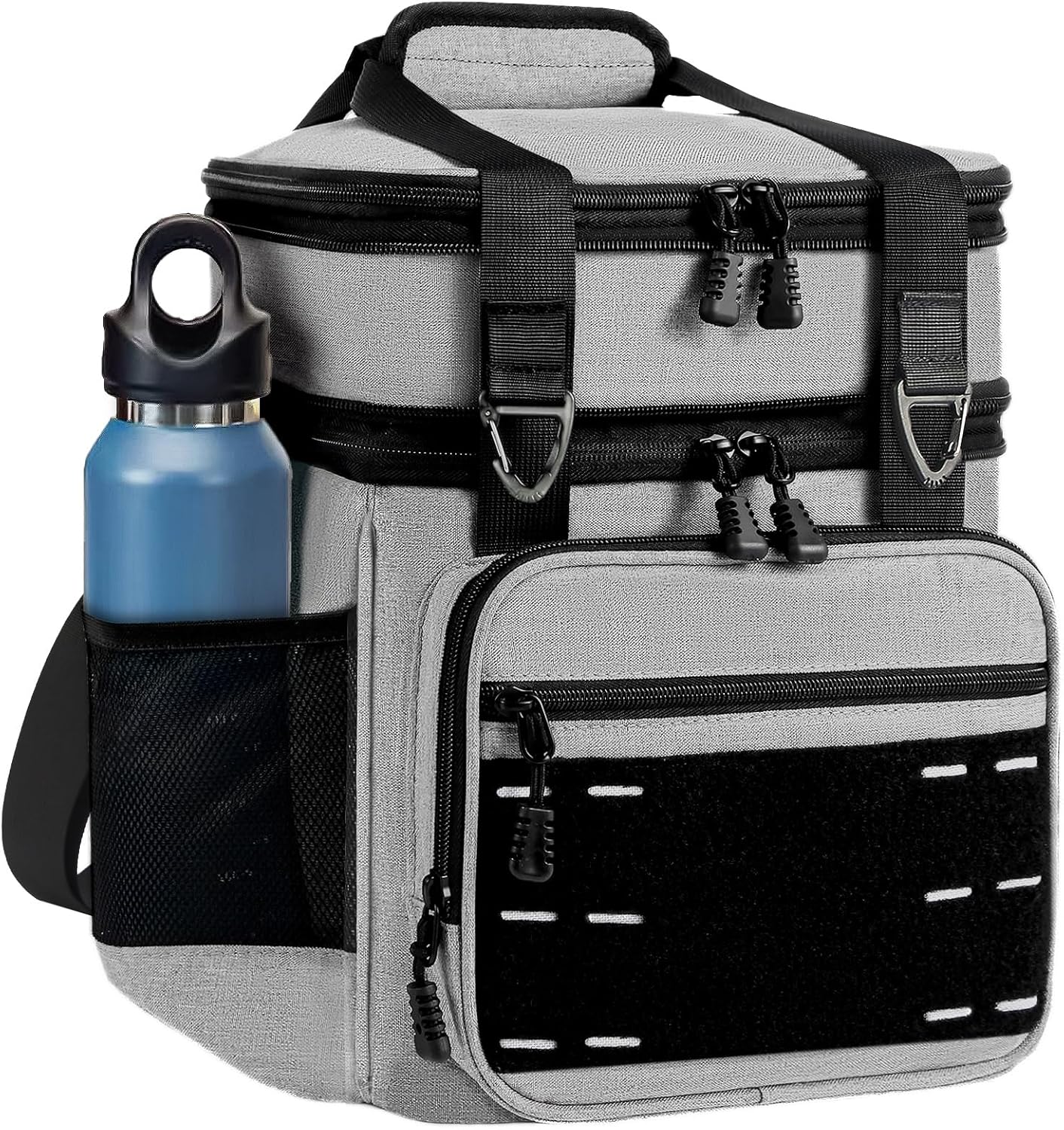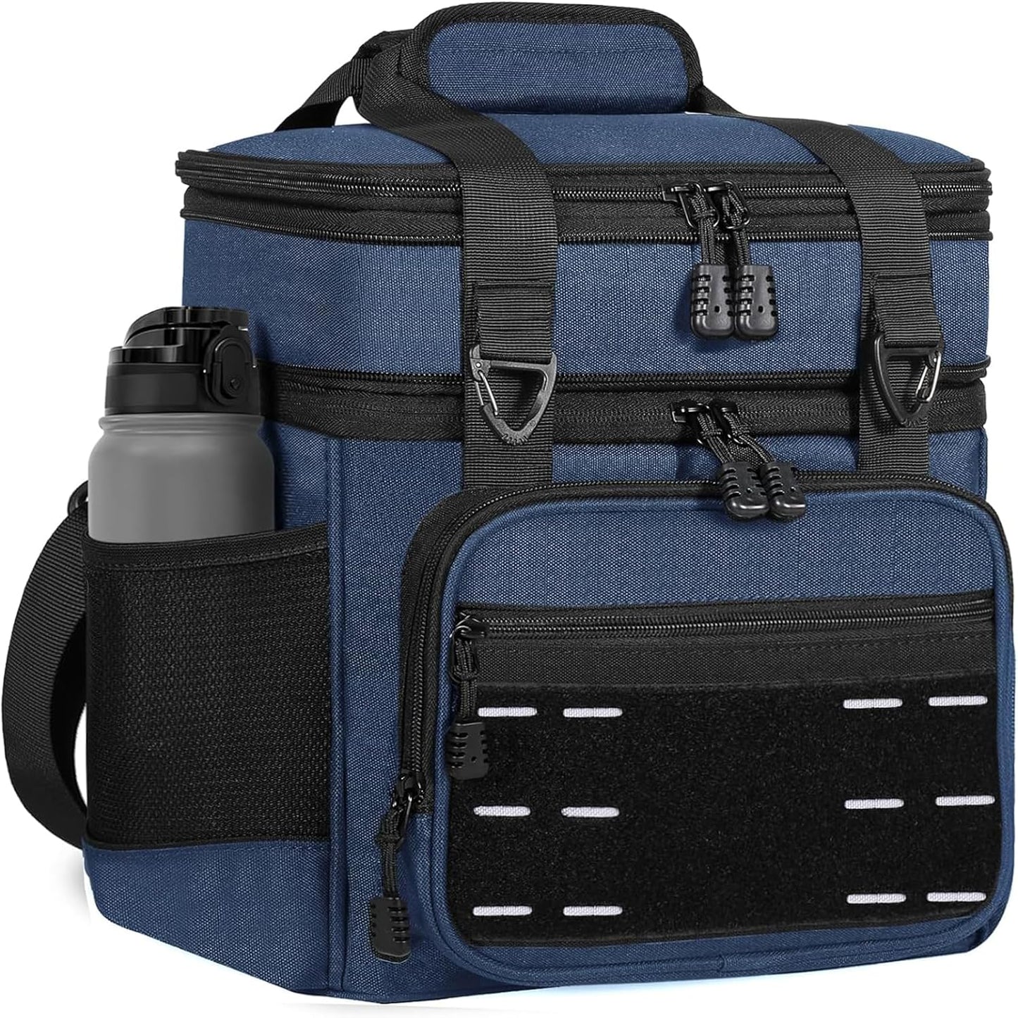 - Multi Functions: This large lunch box has many different compartments to accommodate your needs. Side pockets to keep water bottles, and wallet. A zip mesh pocket on top to store utensils and napkins. The front zippered pockets are good for things like wallets, phones, or keys. It's easy to carry with the adjustable shoulder strap or the handles even if the tactical lunch box is full and heavy.