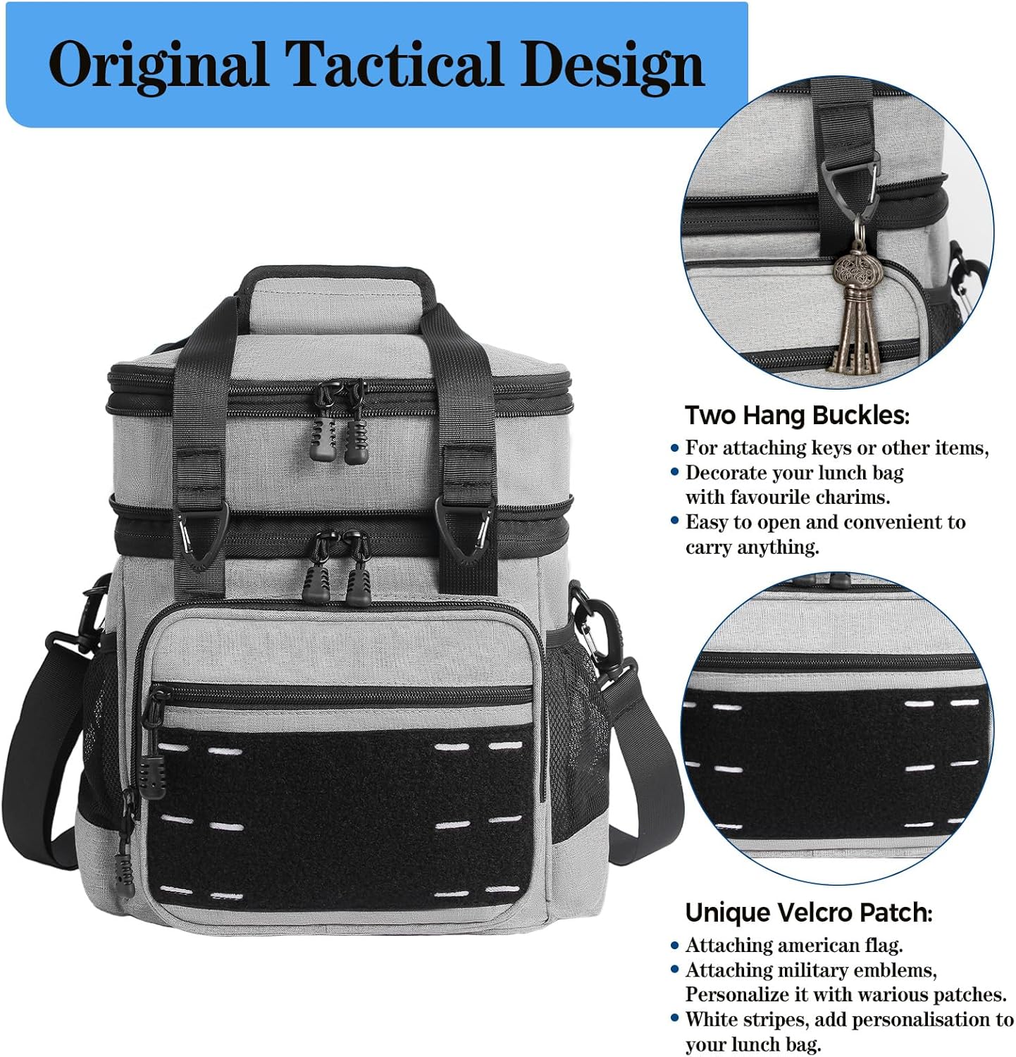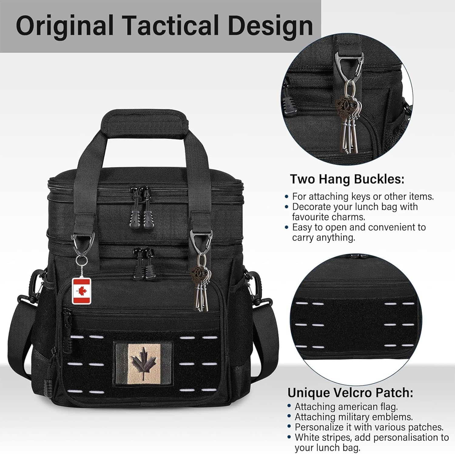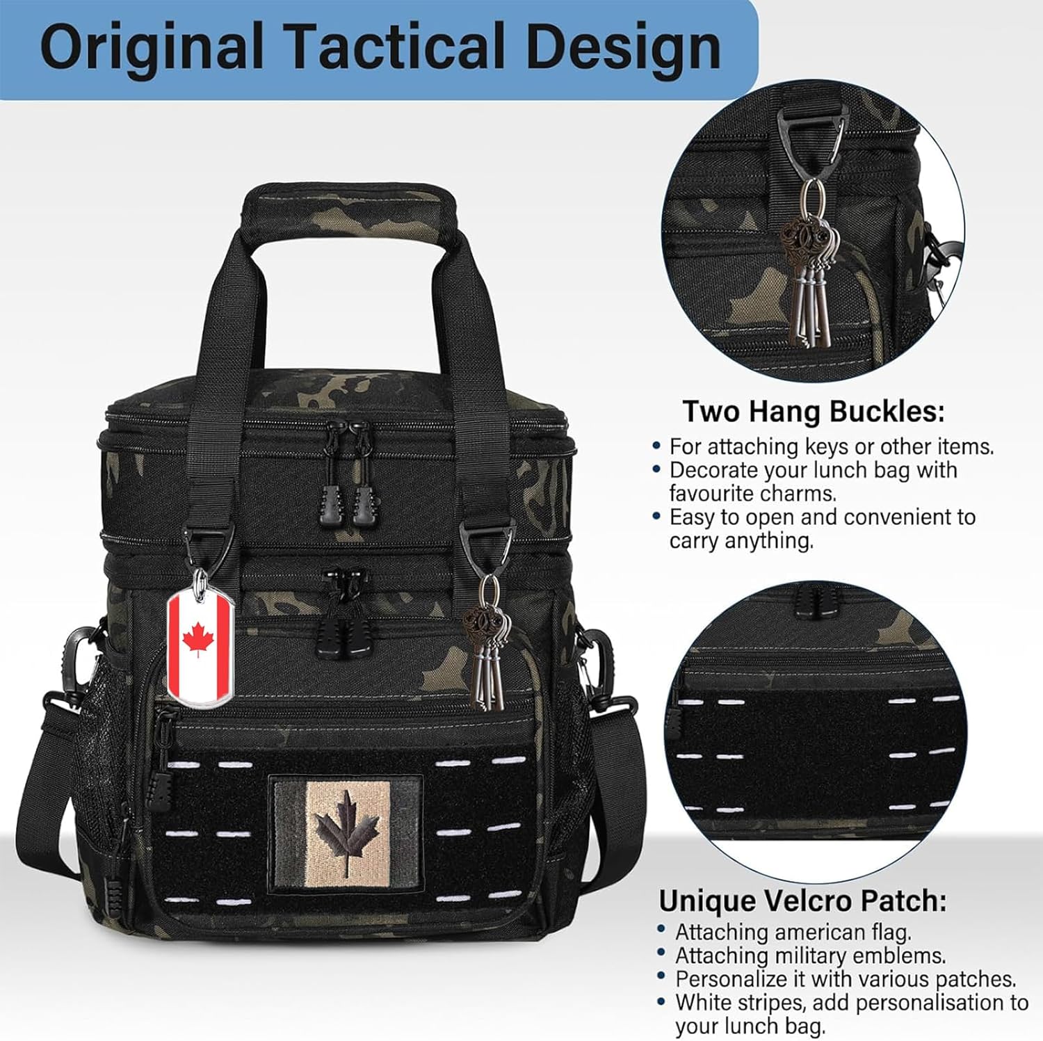 - Unique Tactical Style: With a large Velcro Patch on the side and front pockets, you can customize the lunch box with various patches, to cater to your wide range of needs and preferences. Comes with the American flag to showcase your national pride, adding a touch of personality to the lunch cooler. Two Hang buckles for attaching keys or other items.