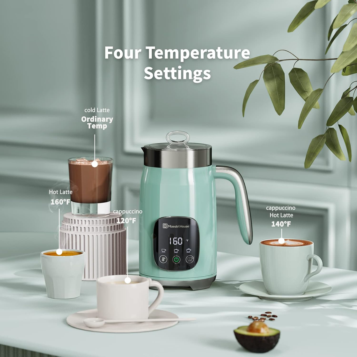 【Variable Temp & Froth Thickness】 The first milk frother features with variable temperature settings and different froth thickness selection in the world. Maestri House electric milk frother offers you 4 temperature settings: Ordinary Temp, 120℉, 140℉, 160℉, and it also provides 3 different froth thickness options: low, medium, and high froth thickness. The ability to control the temperature makes for a superior coffee experience