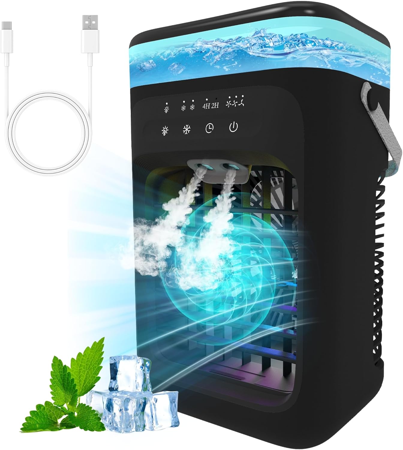 Mecmic Portable Air Conditioner Cooling Fan - 3 Speeds, 2 Mist Modes, 1000mL Water Tank, 7-Color Night Light, 2-4H Timer, Mini Cooling Fan for Bedroom, Office, Camping