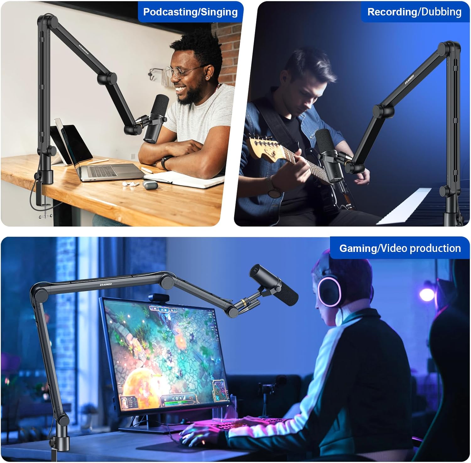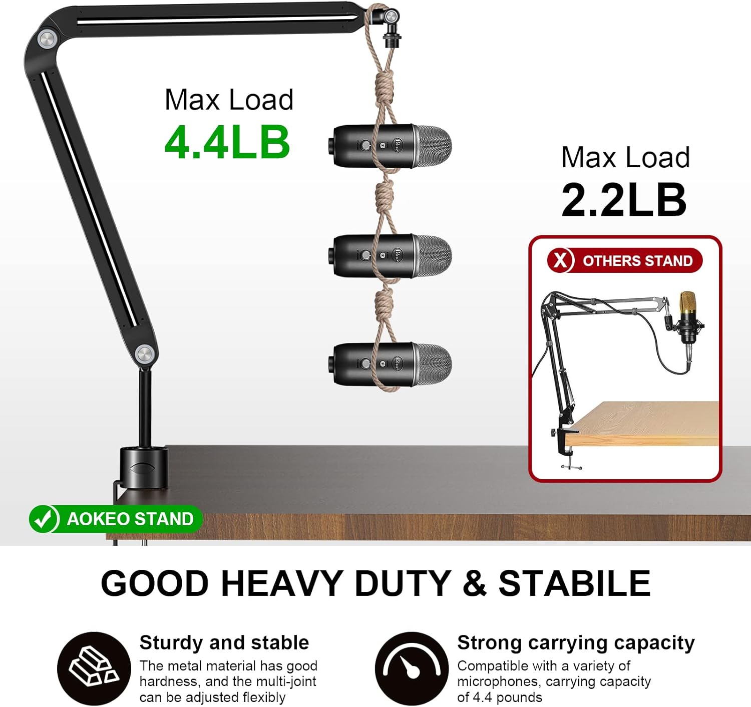 - AOKEO AK-35 microphone arm stand Max Load: Approx 70oz / 1.8KG,it can attach your Blue Snowball & Blue Yeti and fits most of the microphones on the market. Suitable for any stores, Voice-Over ASMR sound studio, Youtube/Facebook Video recording, radio broadcasting, desk, table, TV stations, restaurants, battle station, stage and family performance, etc.