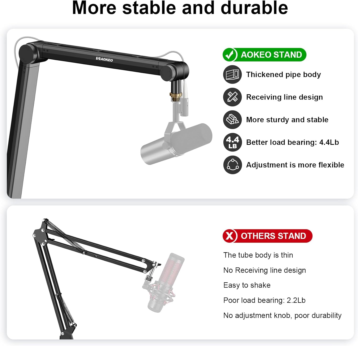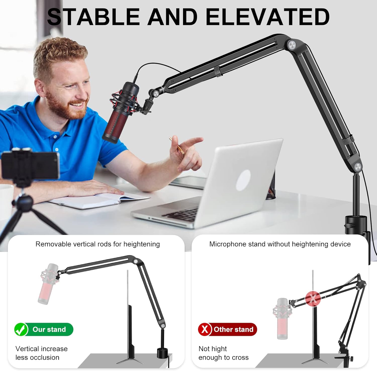 - Sturdy Material:made of high quality steel and electrostatic powder spraying tech. The stand is more durable and anti-rust compared with normal stands. Super spring support ,arm bends back and forth at the base, movement is solid and smooth. It doesn't dip or sink. You can move your microphone to any angle you want to fix it.