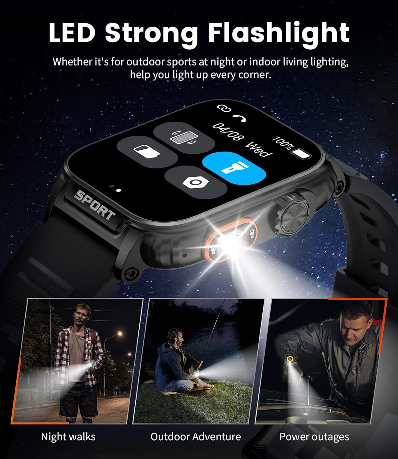 Outdoor smartwatch features a powerful side-mounted LED torch with an illumination range of up to 20 metres. The spotlight lets you navigate in the dark and find your way. Ideal for camping, hiking and night-time adventures. Everyday applications include night-time walks with your dog, power outages, late-night car breakdowns or any situation requiring immediate light. It's a reliable travel companion that provides light in unfamiliar places or unexpected situations.