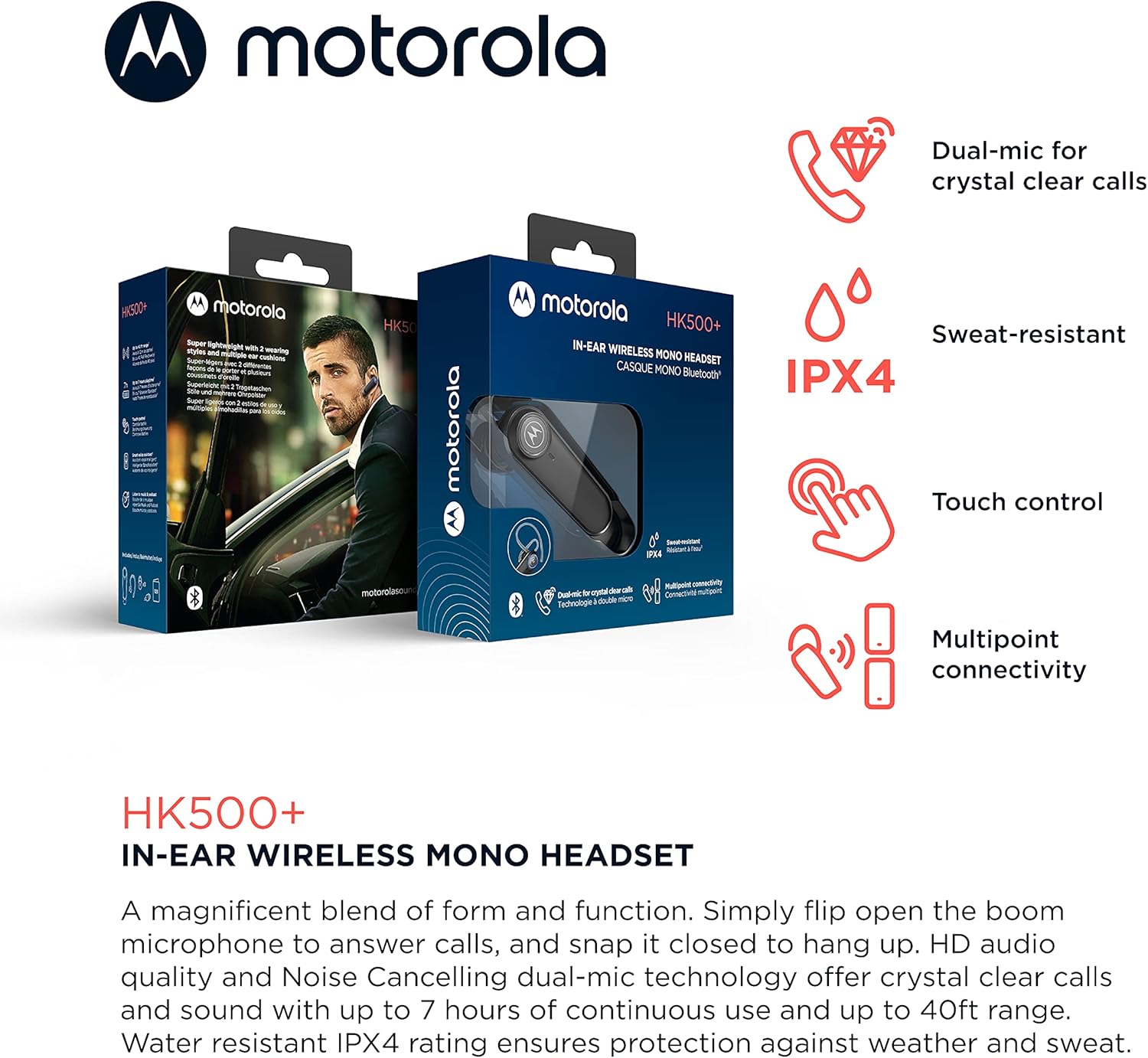 Motorola Sound HK500+ Bluetooth Earpiece Hands-Free Wireless Headset with Microphone - IPX4 Water Resistant Bluetooth Phone Earpiece for Phone Calls, Compatible with iPhone and Cell Phones