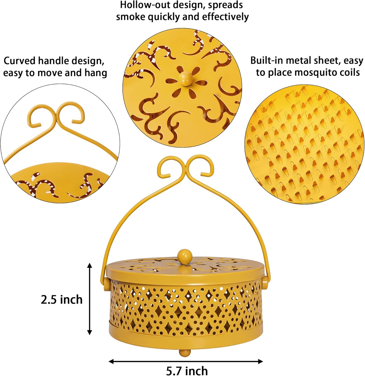 The hollow-out pattern design ensures that mosquito-repellent smoke spreads evenly and quickly, while the enclosed-lid structure minimizes fire hazards and protects the coil from wind. A built-in metal plate at the base secures the coil or incense, while a non-slip handle and base add mobility and surface protection.