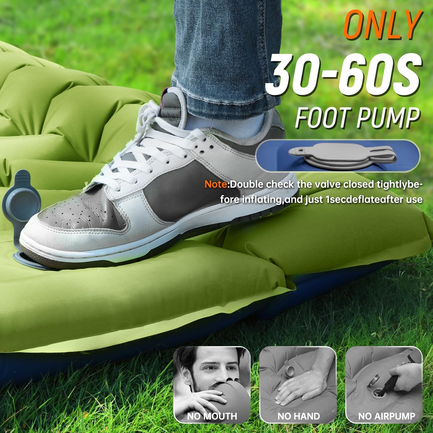 30-60 Seconds To Inflate, 1 Second To Deflate:The camping mattress no need to blow or pump by mouth, just step or press to finish inflation in 30-60 seconds, easy and convenient to operate. Adopting upgraded anti-leakage valve design, completely solve the trouble of air leakage! It takes only 1 second to complete the deflation quickly.