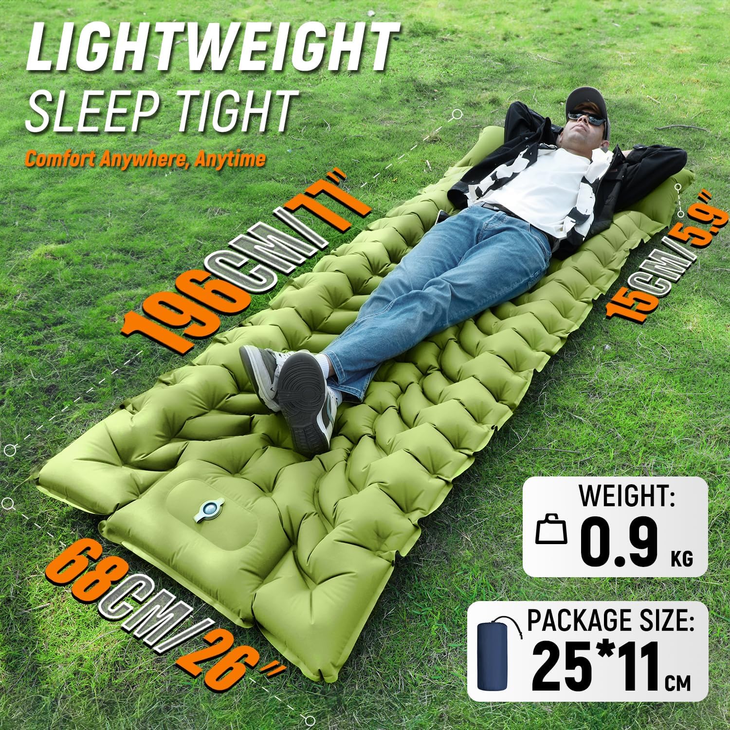 Extra Wide and Thick Camping Sleeping Pad: 196 x 68 x 15cm:This camping sleeping pad features an extra wide 15cm thicker design, providing strong support and comfort even on rough ground and gravel. The one-piece cushioning layer is designed to effectively relieve pressure on the back and neck, helping to regulate the body's balance and allowing you to enjoy a restful night's sleep.