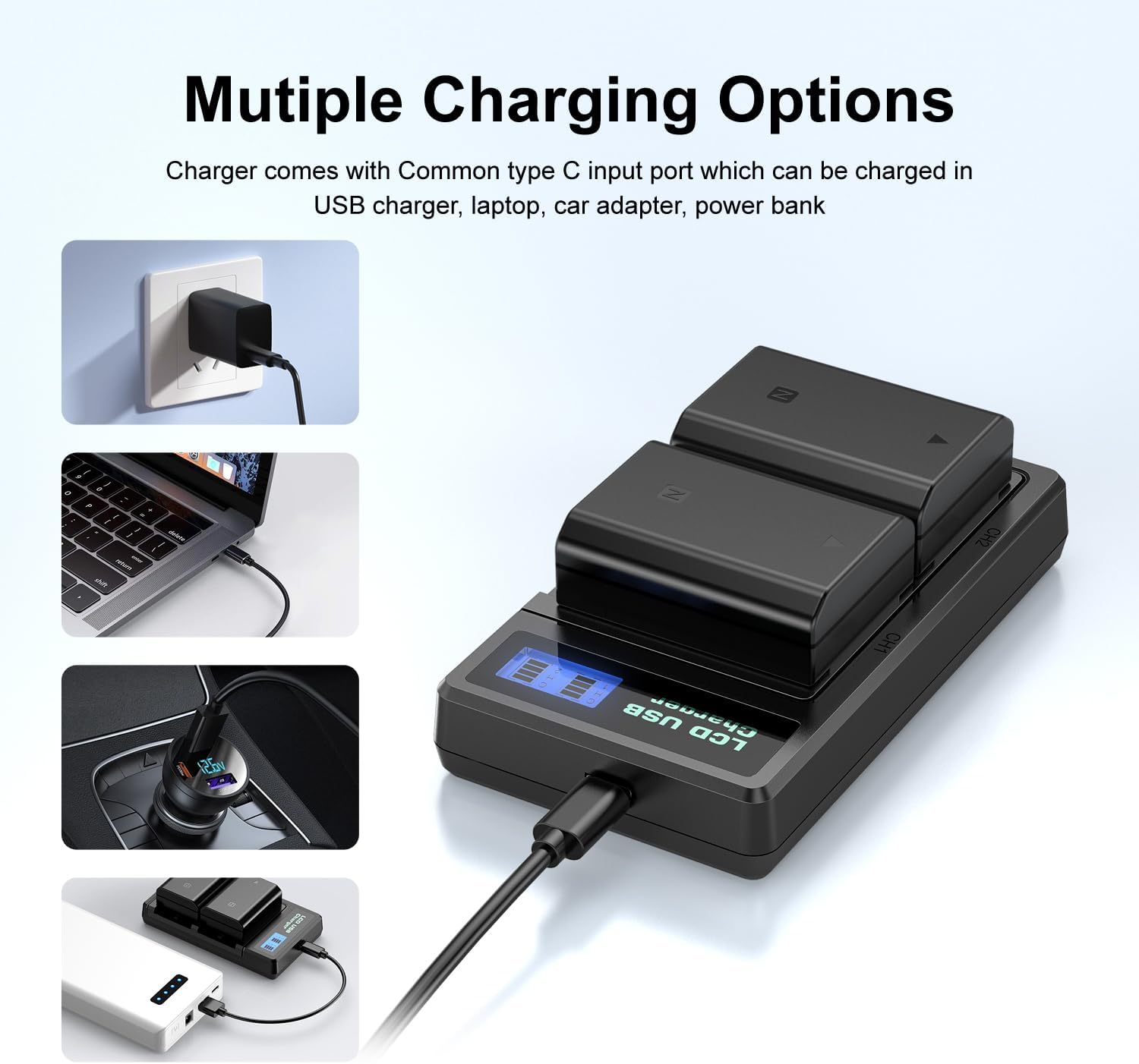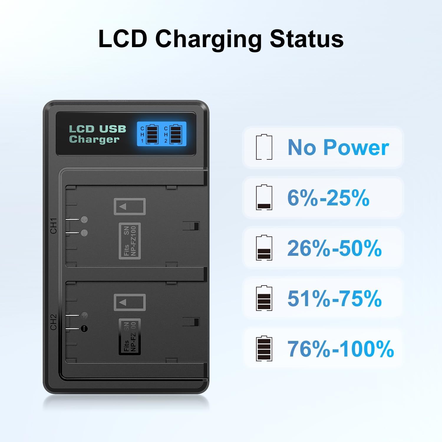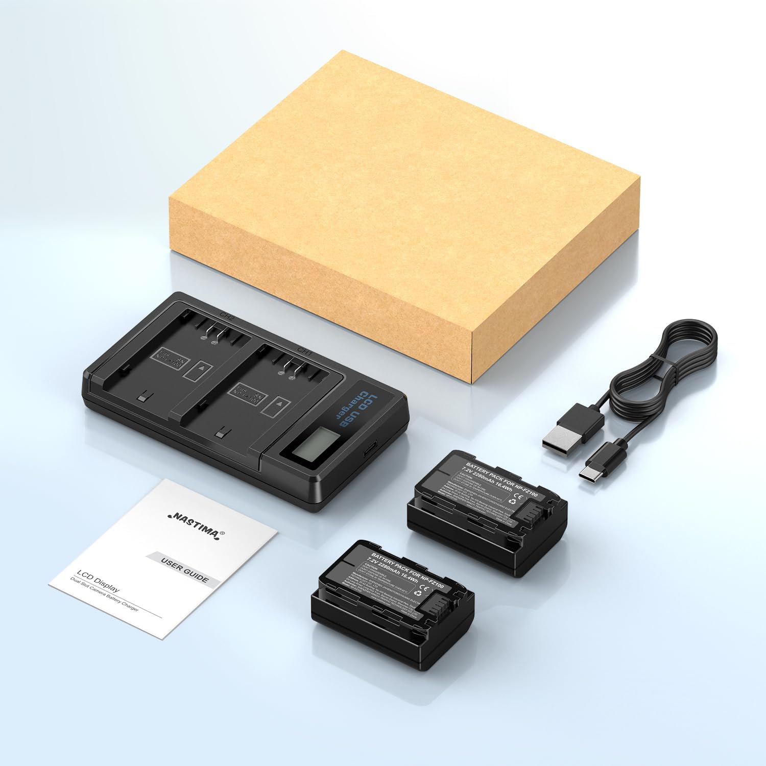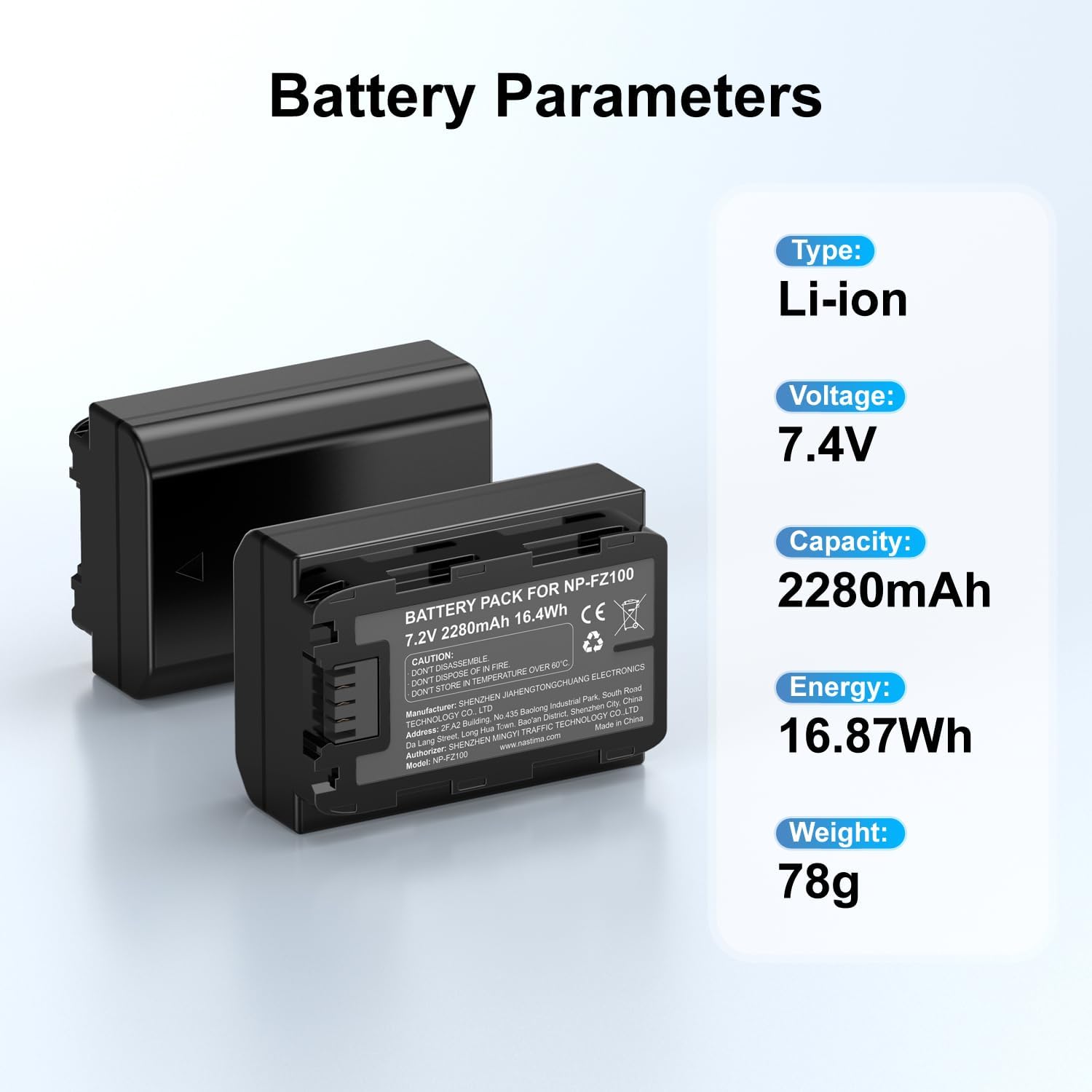 NASTIMA NP-FZ100 2-Pank 2280mAh Battery Replacemnt with LCD Battery Charger Compatible with Sony FX3, FX30, A7iii, A7iv, A7C, A9, A6600, A6700, ZV-E10ii, ZV-E1, A9S, Alpha 9, A7R III, A7R IV, A7RV