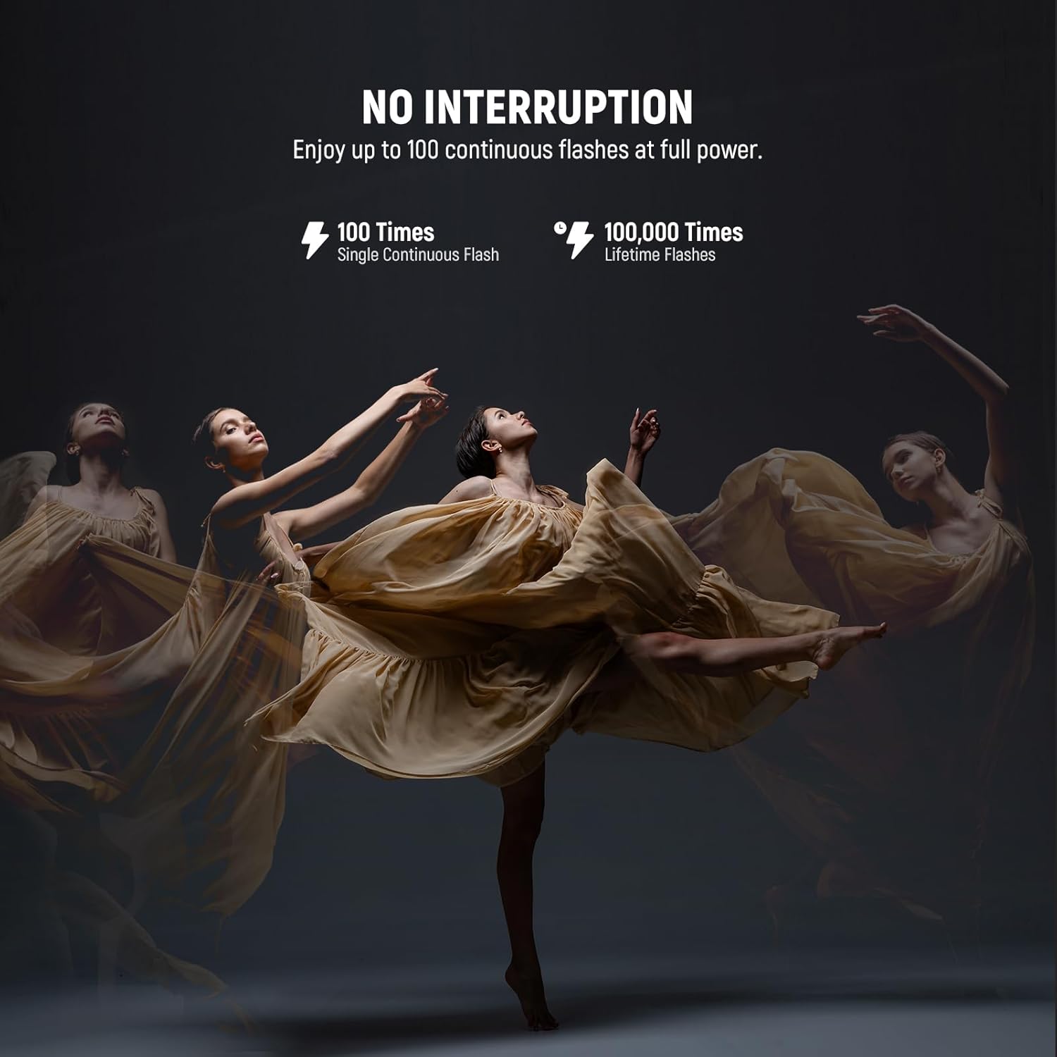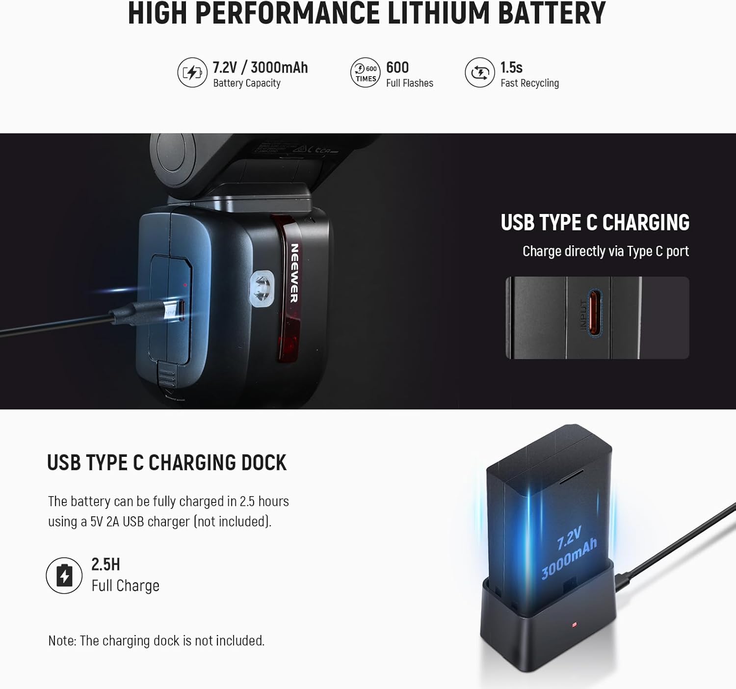 - 【High Capacity & Fast Recycling】 The 7.2V/3000mAh lithium battery provides 600 full power flashes, 1.5s fast recycling time, and a 1/180-1/20000s flash duration. The battery is equipped with a Type C port for external charging, and can be charged in 2.5 hours using a 5V 2A USB charger (not included)
