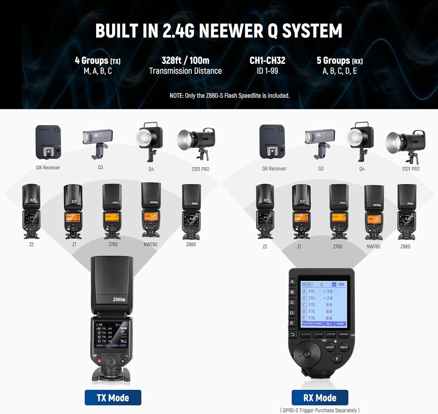 【Built In 2.4G Wireless Q System】 With NEEWER 2.4G Q System, the flash has 4 master groups (A/B/C/D), 5 slave groups (A/B/C/D/E, D/E for QPro triggers), 32 channels (1-32), and 99 IDs (1-99), compatible with the QPRO-C Trigger (sold separately) for wireless flash control. It can work as a master/slave unit for other Q system flashes and allows wireless flash sync within 328'/100m (no obstacles)