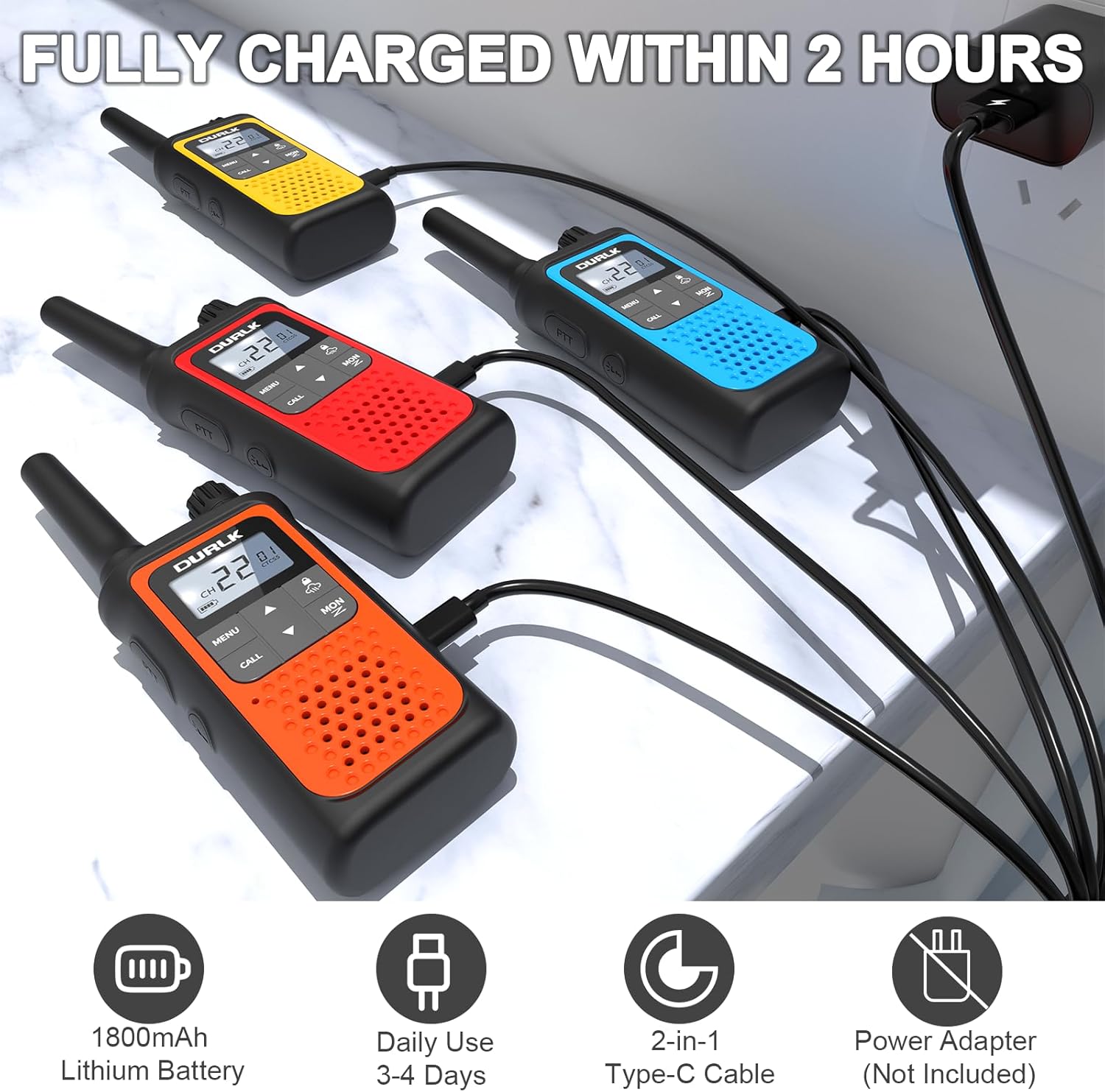- Rechargeable and Durable Li-ion Battery: NXGKET walkie talkies feature a built-in 1800mAh rechargeable lithium-ion battery, so there’s no need to buy extra batteries—more cost-effective and eco-friendly. A full charge lets you use the walkie talkies for 3–4 days. Plus, the included 2-in-1 USB-C charging cable lets you charge both devices at the same time.