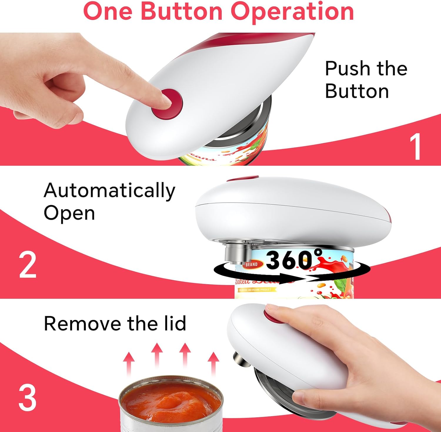 - 【One click to open】Simplify your kitchen routine with a single press to open cans effortlessly. This can opener has a slanted blade, that's designed and not a product quality issue.