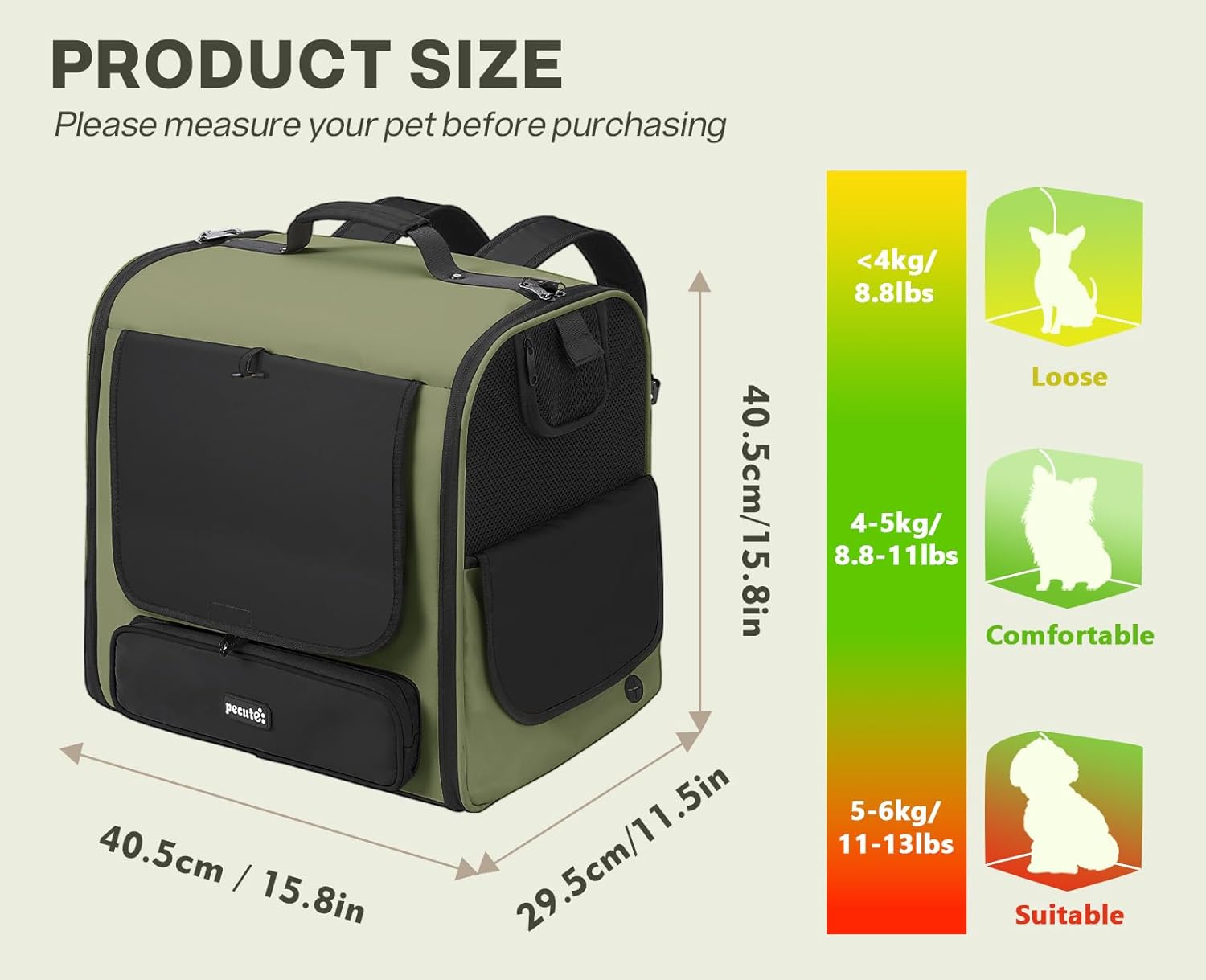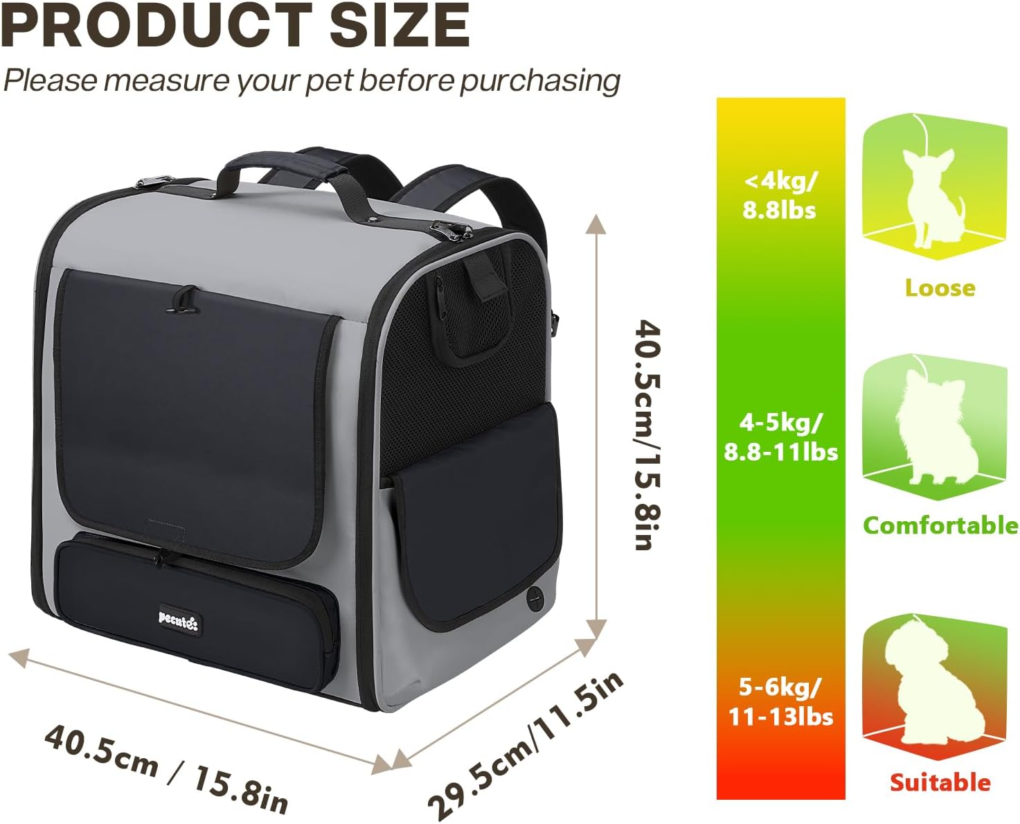 - Widened: Pet backpack dimensions 40.5*40.5*29.5cm, bigger than other backpacks, providing enough space for pets to lie down and stand up. Please measure your pet before purchasing, suitable for cats <7kg/15.4lbs; suitable for dogs <6kg/13.2lbs, sitting height (from front legs to top of head) ≤40cm/15.6".