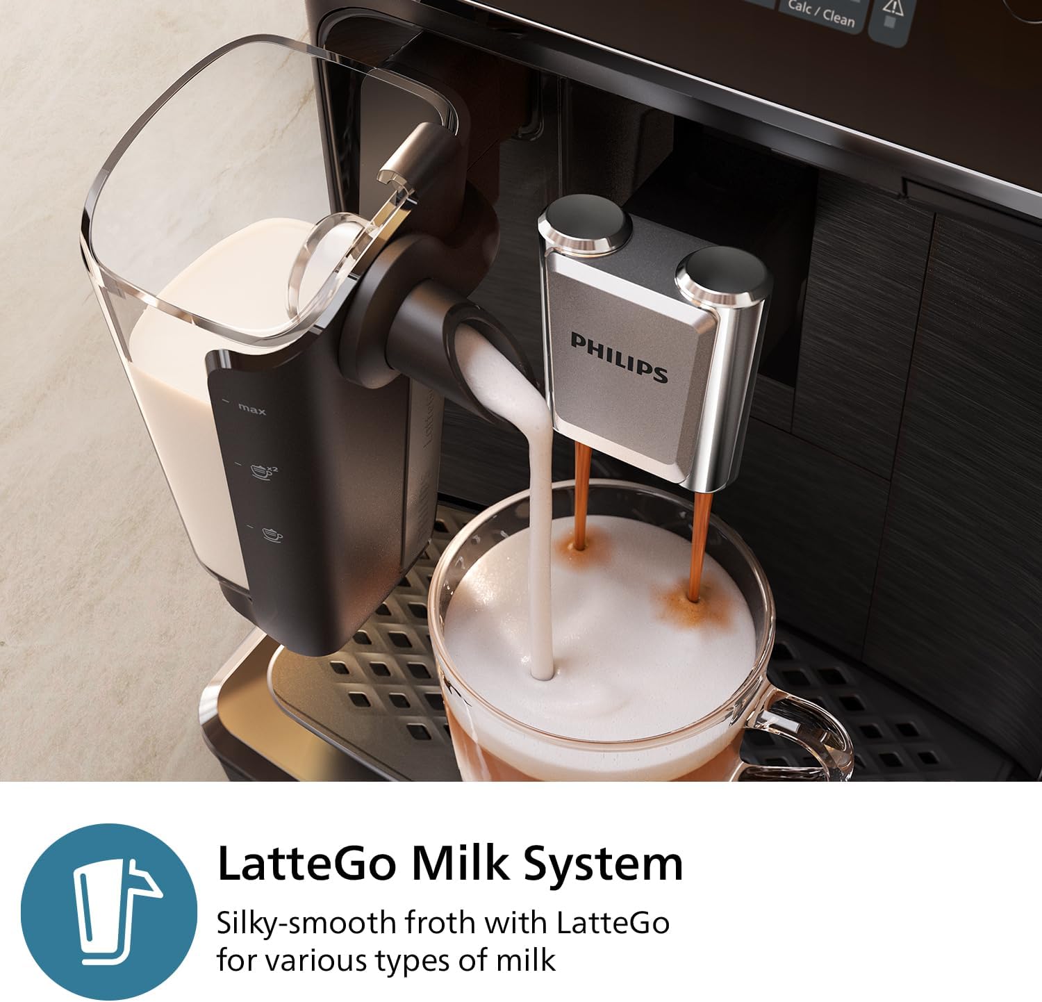 Effortlessly enjoy 4 drinks, from classic espresso, regular coffee, cappuccino, to hot water for tea, with the perfect crema, aroma and temperature. At the touch of a button, LatteGo automatically prepares silky smooth milk froth for your milky coffees, is easy to set up and can be cleaned in as little as 10 seconds* under the tap or in the dishwasher.