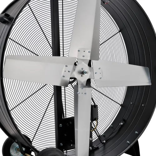 Getting warm while on the job? Roll in the Global Industrial™ 42" Portable Drum Blower Fan. This belt-driven 42" diameter model has 4 steel blades and 2 solid rubber wheels. It operates on a quiet 2-speed motor that makes it ideal for environments where concentration is key. The fan is also built with thermal cutoff for overheat protection and runs on an open-air motor. The exterior of the fan has built-in safety guards and a graspable handle for easy portability. 18'L 3-conductor power cord with plug eliminates the need for extension cords. Sturdy steel housing for the drum frame. Powder-coat black finish. ETL, cETL Listed. Meets OSHA and UL507 Standards. 1-Year Limited Warranty.