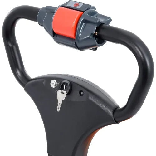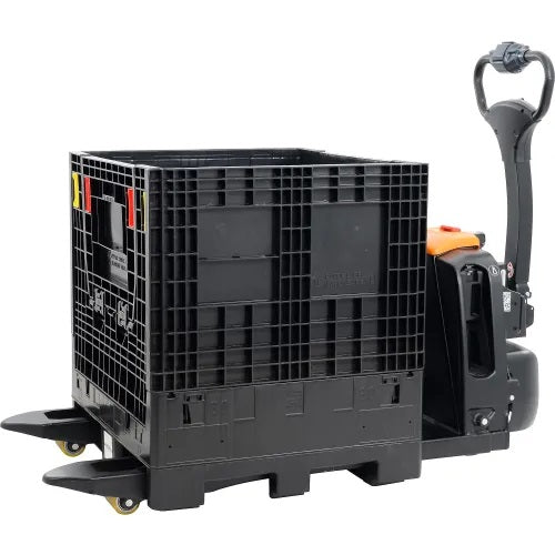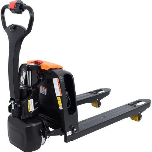 Increase productivity with the Global Industrial™ Lithium Powered Pallet Truck. Equipped with polyurethane drive, load, and steer wheels, this battery powered pallet truck rolls smoothly on surfaces in warehouses, retail stores, and distribution centers. With just the push of a button, it smoothly lifts and lowers pallet loads of up to 3300 lbs. Engineered for ambidextrous use, this truck's dual butterfly control switch allows for easy forward and reverse travel. Its ergonomic handle features an emergency stop switch that immediately stops the machine and reverses it for added safety. Operators can get up to 3 hours of service per charge. Limited 1-Year Warranty.