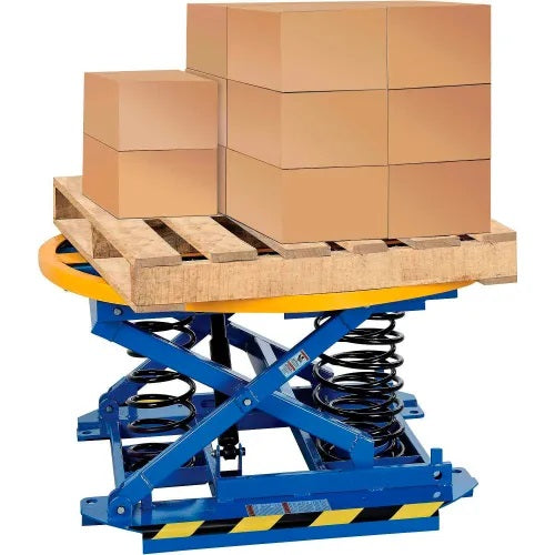 This ergonomic tool is ideal for building or unpacking pallet loads. A combination of heavy-duty springs and shock-absorbing dampener help maintain a constant working height without overshoot or spring bounce, lowering and raising the carousel as packages are removed or added. No power or air supply is required, and it is virtually maintenance-free. The 43-5/8" diameter turntable features low-friction bearings for smooth operation. Full 360° access allows for nearside loading without reaching, as the operator can step closer to the unit's platform to add or remove pallet loads. Wide, free-standing base features 36-5/8"L x 6"W x 2"H fork pockets for easy relocation by fork lift. Strong tubular steel frame with durable powder-coat finish for long life. 1-Year Limited Warranty.