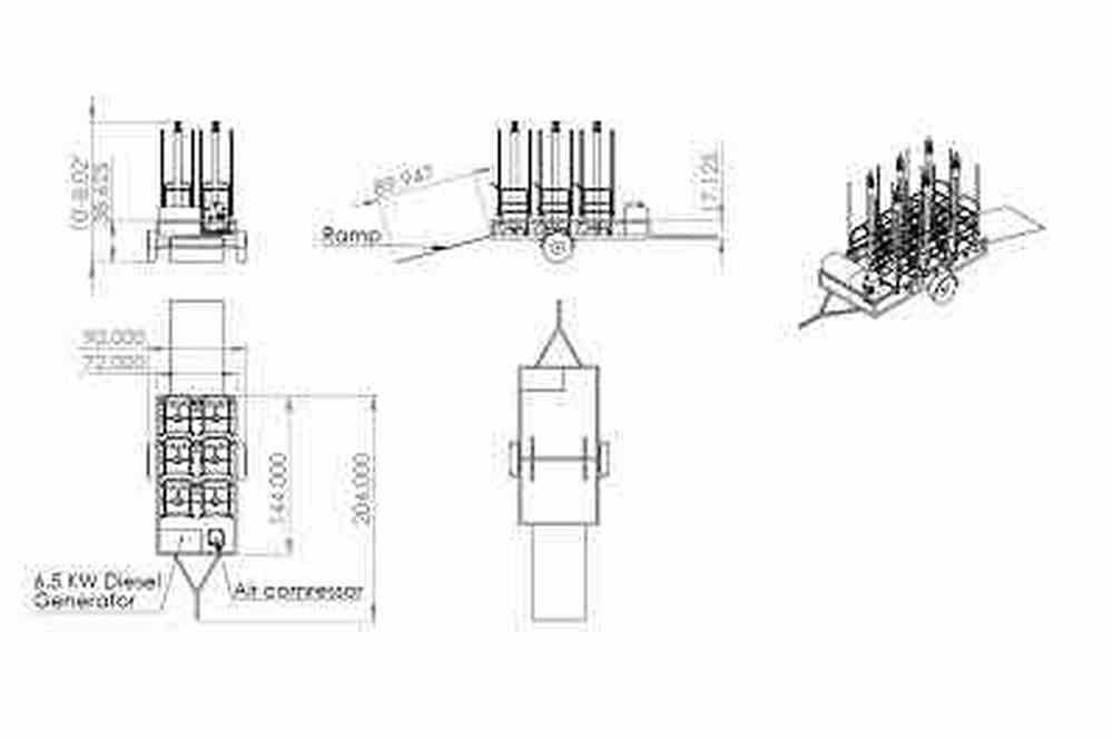 Trailer with 6 carts and umbilical cable system for pad areas 300 feet by 500 feet in size. This system includes 3 major components, including the transport trailer with air compressor and generator, six portable cart LED light towers and the umbilical system that carrier air and power to each cart.